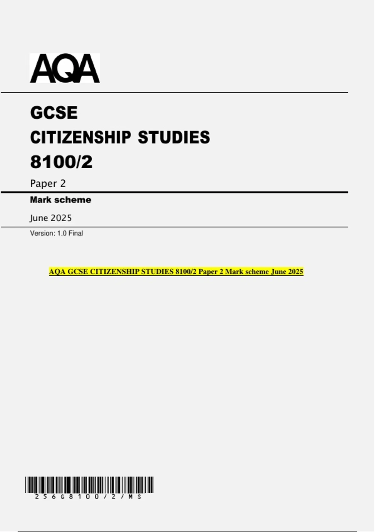AQA GCSE CITIZENSHIP STUDIES 8100/2 Paper 2 Mark scheme June 2025