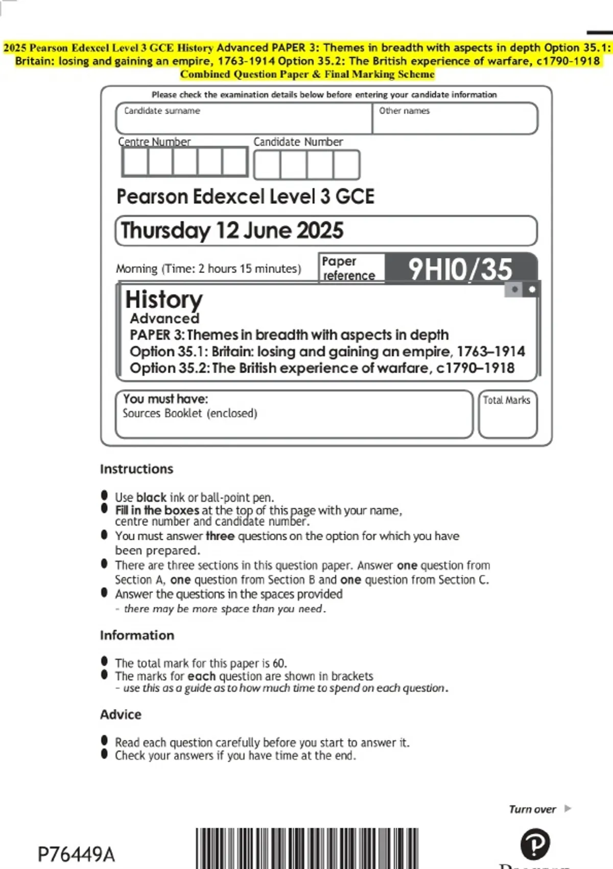 2025 Pearson Edexcel Level 3 GCE History Advanced PAPER 3: Themes in breadth with aspects in depth Option 35.1: Britain: losing and gaining an empire, 1763–1914 Option 35.2: The British experience of warfare, c1790–1918 Examination Paper and Final Marking Scheme