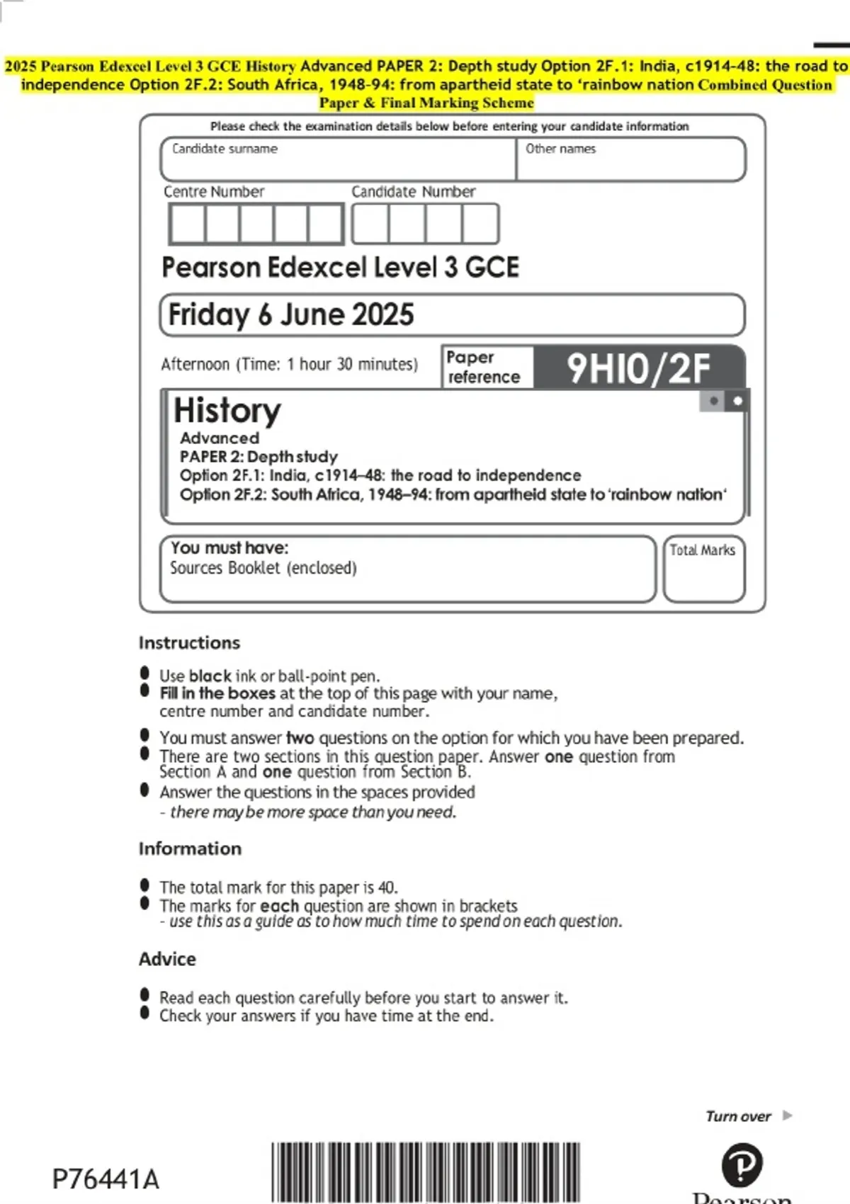 2025 Pearson Edexcel Level 3 GCE History Advanced PAPER 2: Depth study Option 2F.1: India, c1914–48: the road to independence Option 2F.2: South Africa, 1948–94: from apartheid state to ‘rainbow nation Examination Paper and Final Marking Scheme