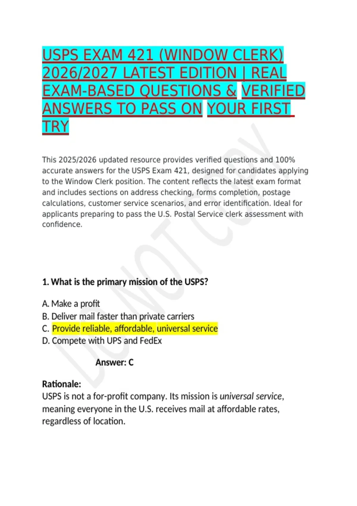 This document contains the latest USPS Exam 421 Window Clerk questions for the 2026/2027 testing cycle, based on real exam-style content and provided with verified correct answers. It covers core areas such as postal products and services, mail classes, pricing, retail transactions, customer service standards, and window clerk procedures. All questions are fully answered and graded, making this resource ideal for first-time test takers seeking structured preparation and exam-ready practice.