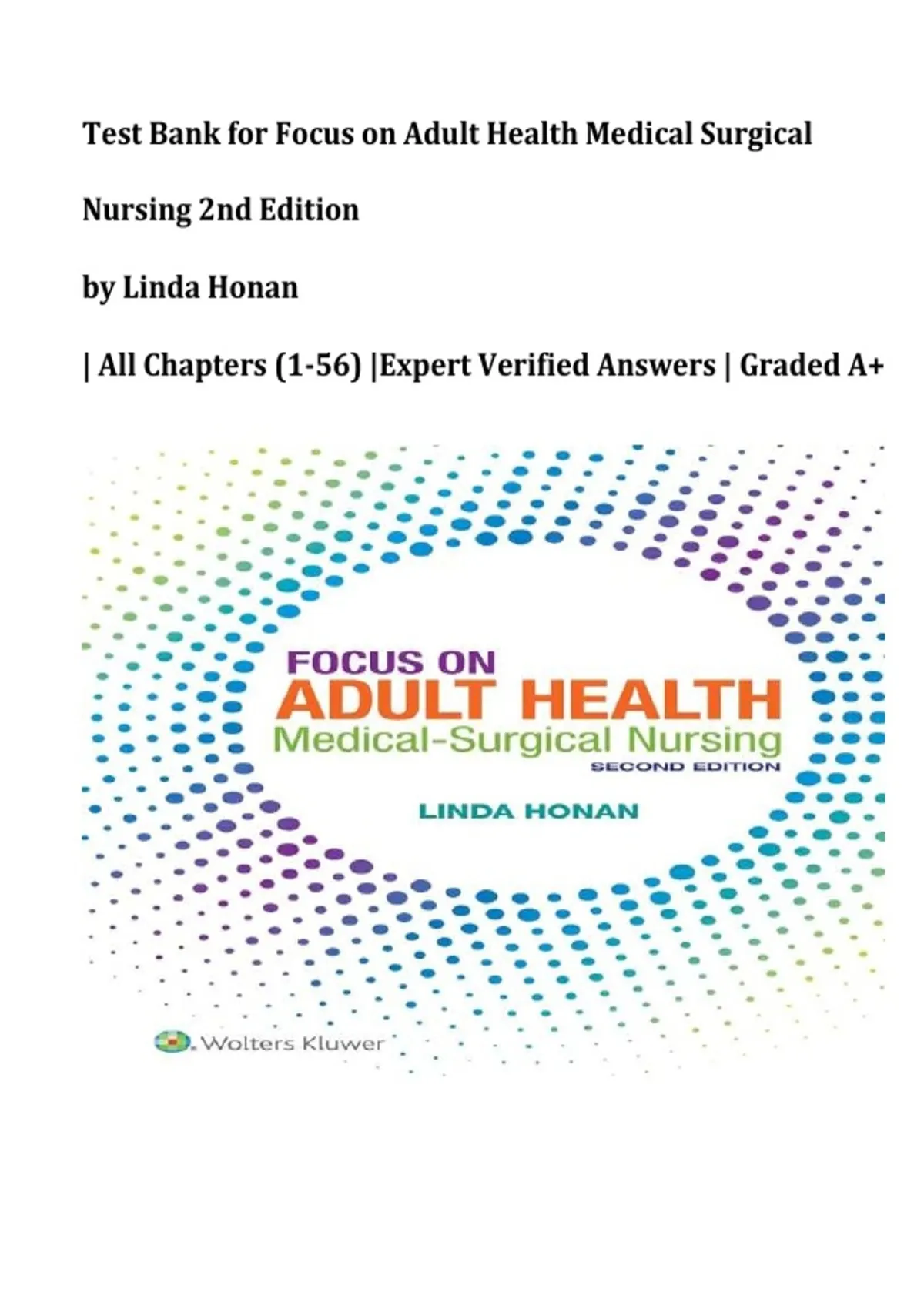 This test bank covers all chapters from Focus on Adult Health: Medical-Surgical Nursing (2nd Edition) by Linda Honan, including chapters 1 through 56. It provides extensive practice questions with expert-verified answers to support exam preparation and clinical knowledge development in adult health and medical-surgical nursing. The material is aligned with nursing curricula and is suitable for students preparing for quizzes, exams, and clinical assessments.