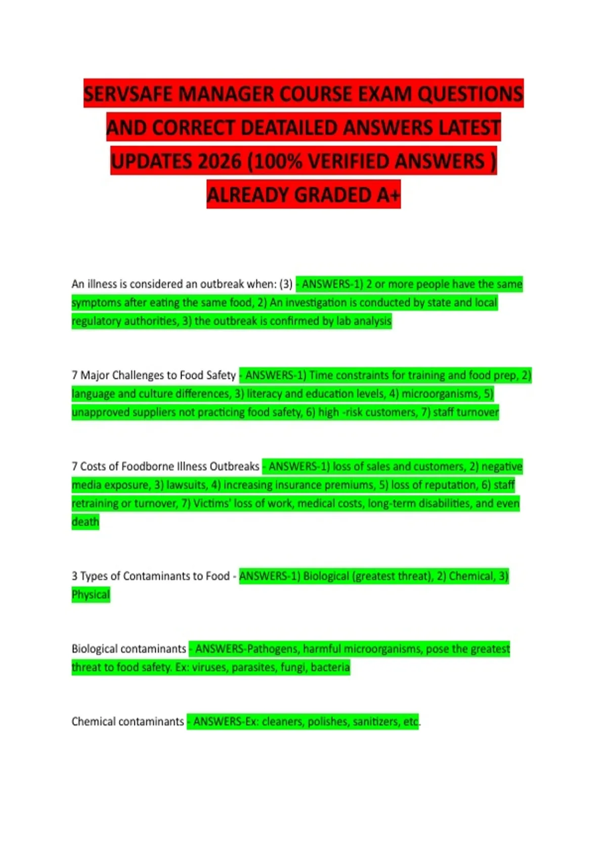 3 Types of Contaminants to Food - ANSWERS-1) Biological (greatest threat), 2) Chemical, 3)