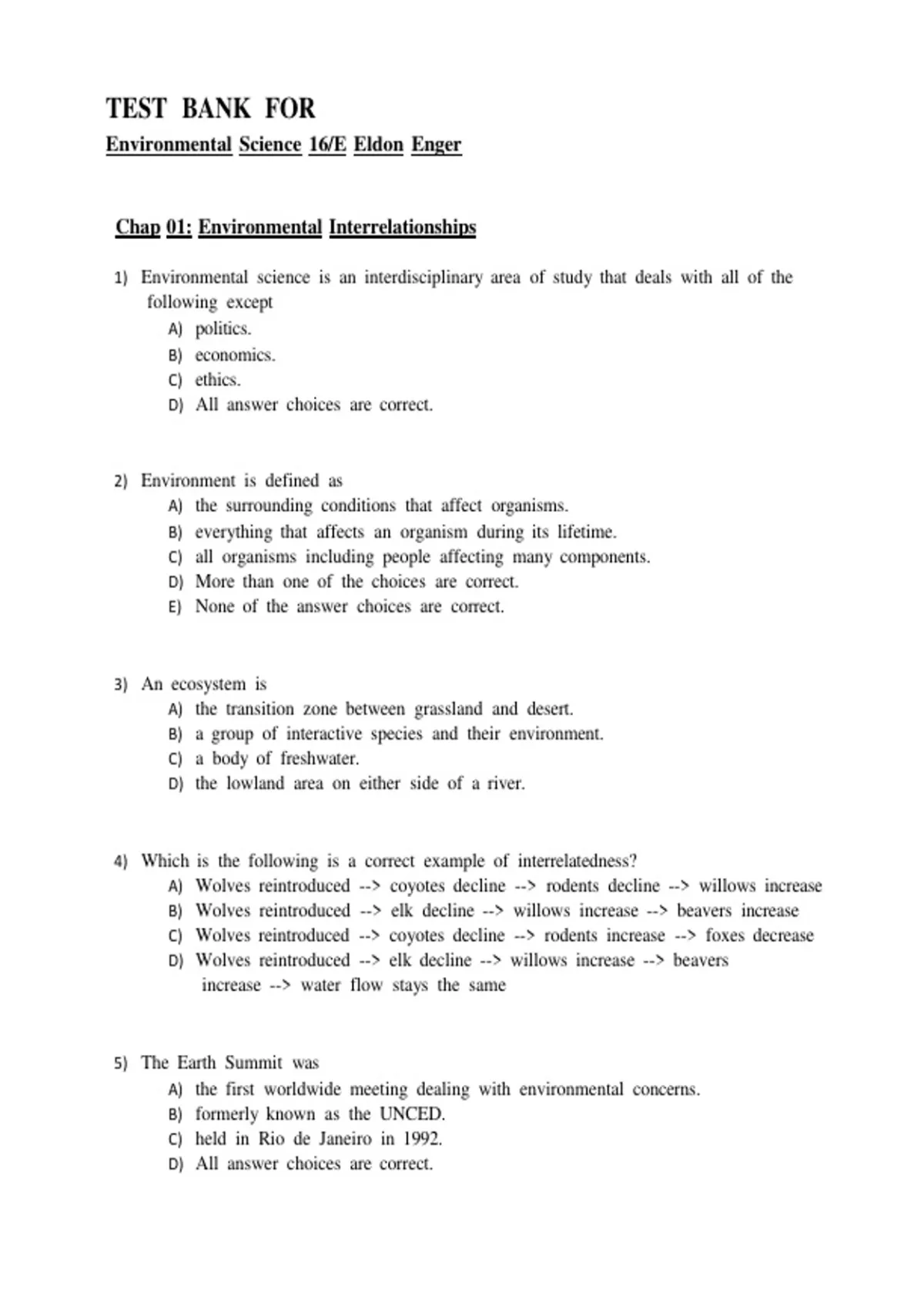 This document provides the complete Test Bank for Environmental Science (16th Edition) by Eldon Enger and Bradley Smith. It includes chapter-by-chapter multiple-choice questions, concept-application items, and detailed answer explanations aligned with the textbook’s coverage of environmental principles. Topics include ecosystems, biodiversity, population dynamics, energy resources, pollution, climate change, water and soil resources, sustainability, and environmental policy. This comprehensive test bank is ideal for exam preparation, coursework support, and instructor assessment use.