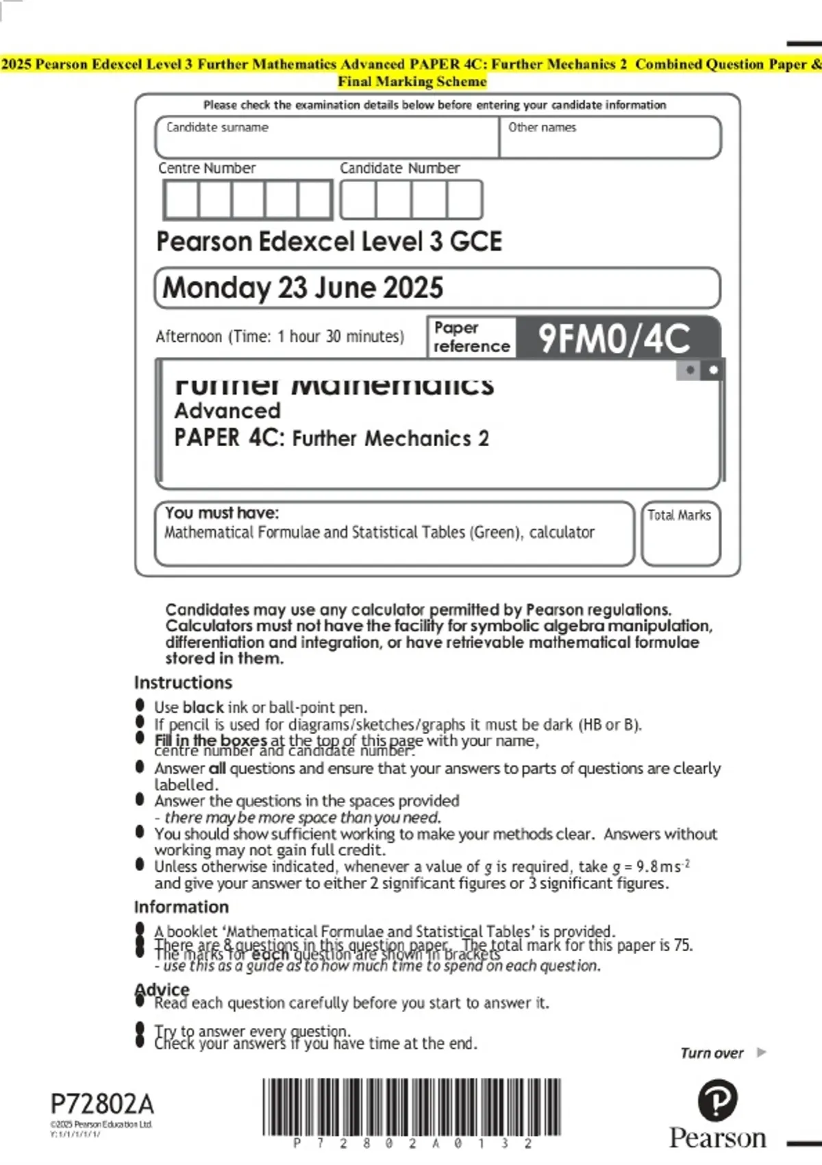 2025 Pearson Edexcel Level 3 Further Mathematics Advanced PAPER 4C: Further Mechanics 2 Examination Paper and Final Marking Scheme