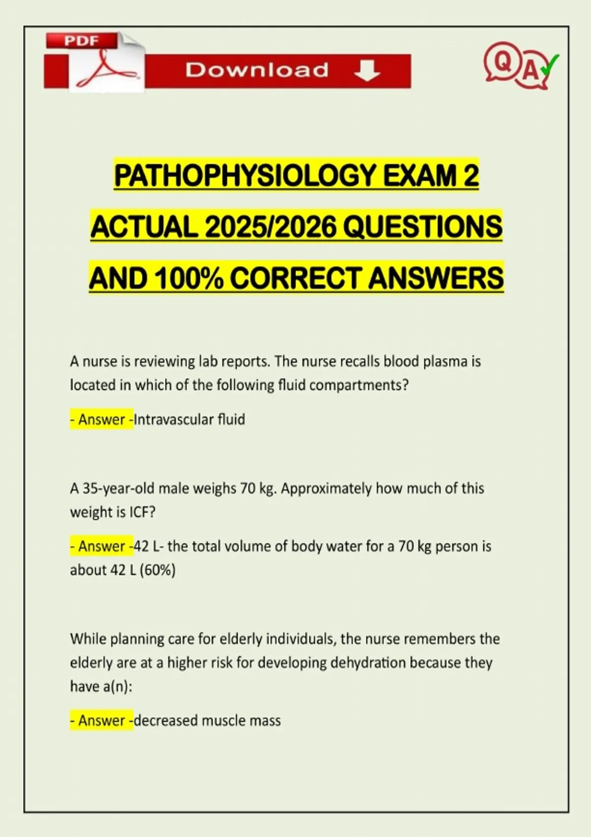 PATHOPHYSIOLOGY EXAM 2 ACTUAL 2025/2026 QUESTIONS AND 100% CORRECT ANSWERS A nurse is reviewing lab reports. The nurse recalls blood plasma is located in which of the following fluid compartments? - Answer -Intravascular fluid A 35-year-old male weighs 70 kg. Approximately how much of this weight is ICF? - Answer -42 L- the total volume of body water for a 70 kg person is about 42 L (60%) While planning care for elderly individuals, the nurse remembers the elderly are at a higher risk for developing