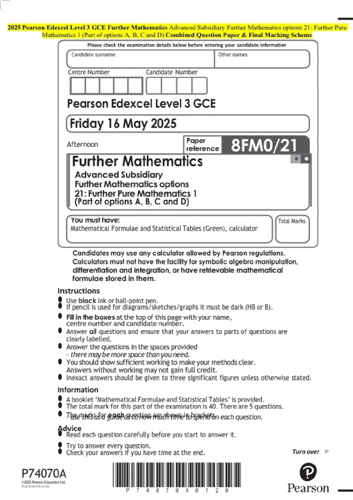 2025 Pearson Edexcel Level 3 GCE Further Mathematics Advanced Subsidiary Further Mathematics options 21: Further Pure Mathematics 1 (Part of options A, B, C and D) Examination Paper and Final Marking Scheme