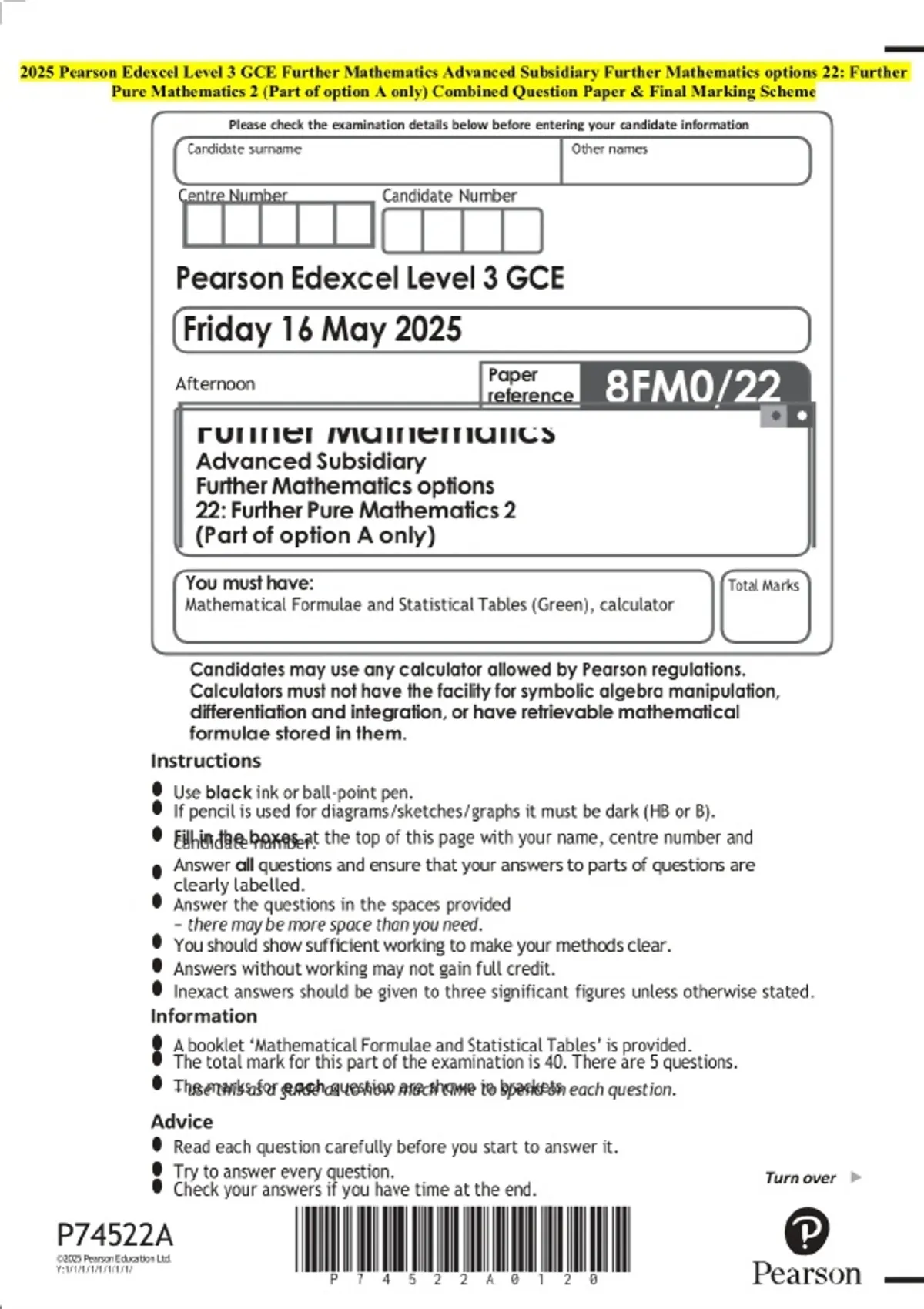 2025 Pearson Edexcel Level 3 GCE Further Mathematics Advanced Subsidiary Further Mathematics options 22: Further Pure Mathematics 2 (Part of option A only) Examination Paper and Final Marking Scheme
