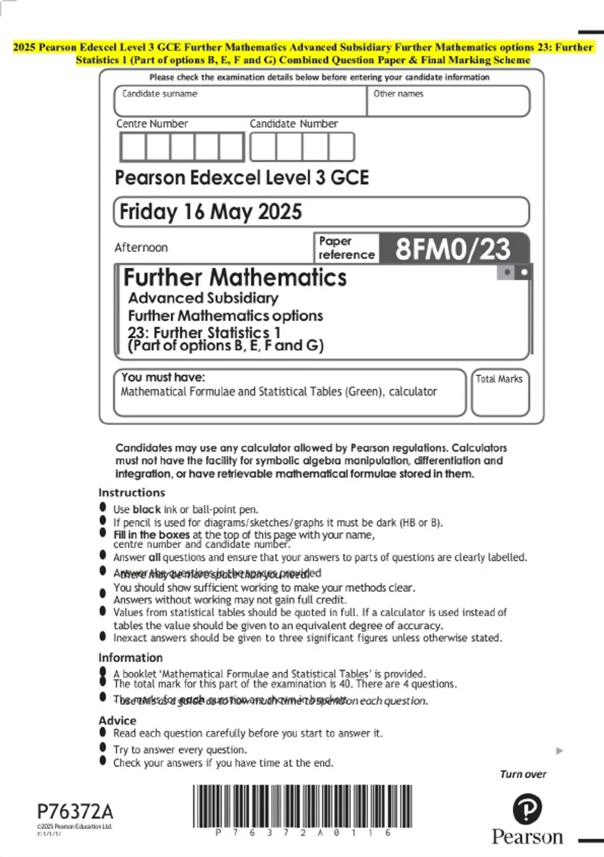 2025 Pearson Edexcel Level 3 GCE Further Mathematics Advanced Subsidiary Further Mathematics options 23: Further Statistics 1 (Part of options B, E, F and G) Examination Paper and Final Marking Scheme
