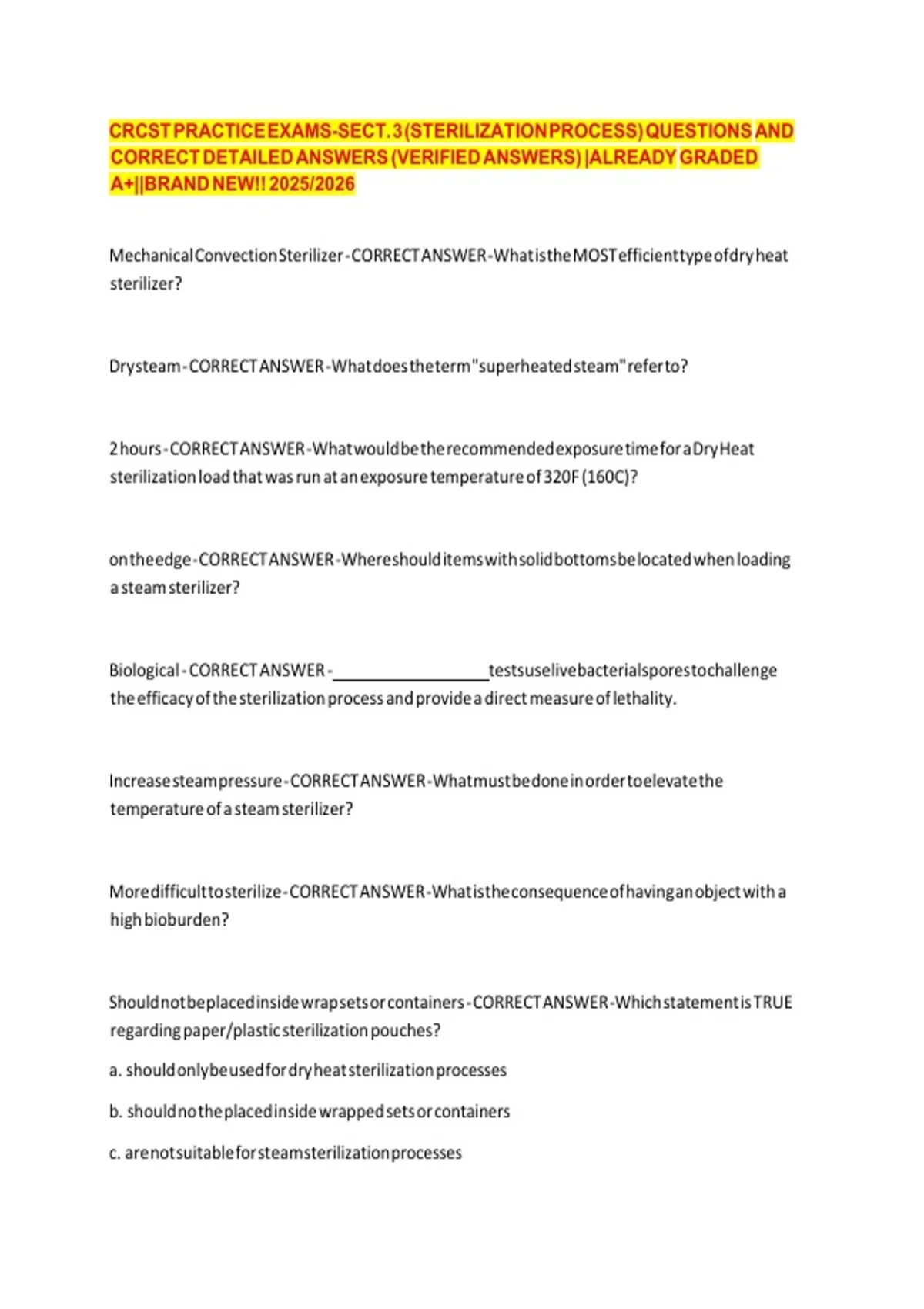 CRCST PRACTICE EXAMS-SECT. 3 (STERILIZATION PROCESS) QUESTIONS AND