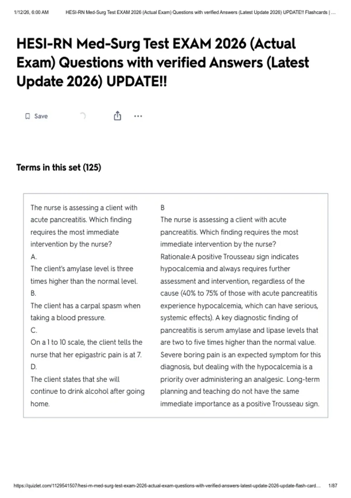 1/12/26, 6:00 AM HESI-RN Med-Surg Test EXAM 2026 (Actual Exam) Questions with verified Answers (Latest Update 2026) UPDATE!! Flashcards | …
