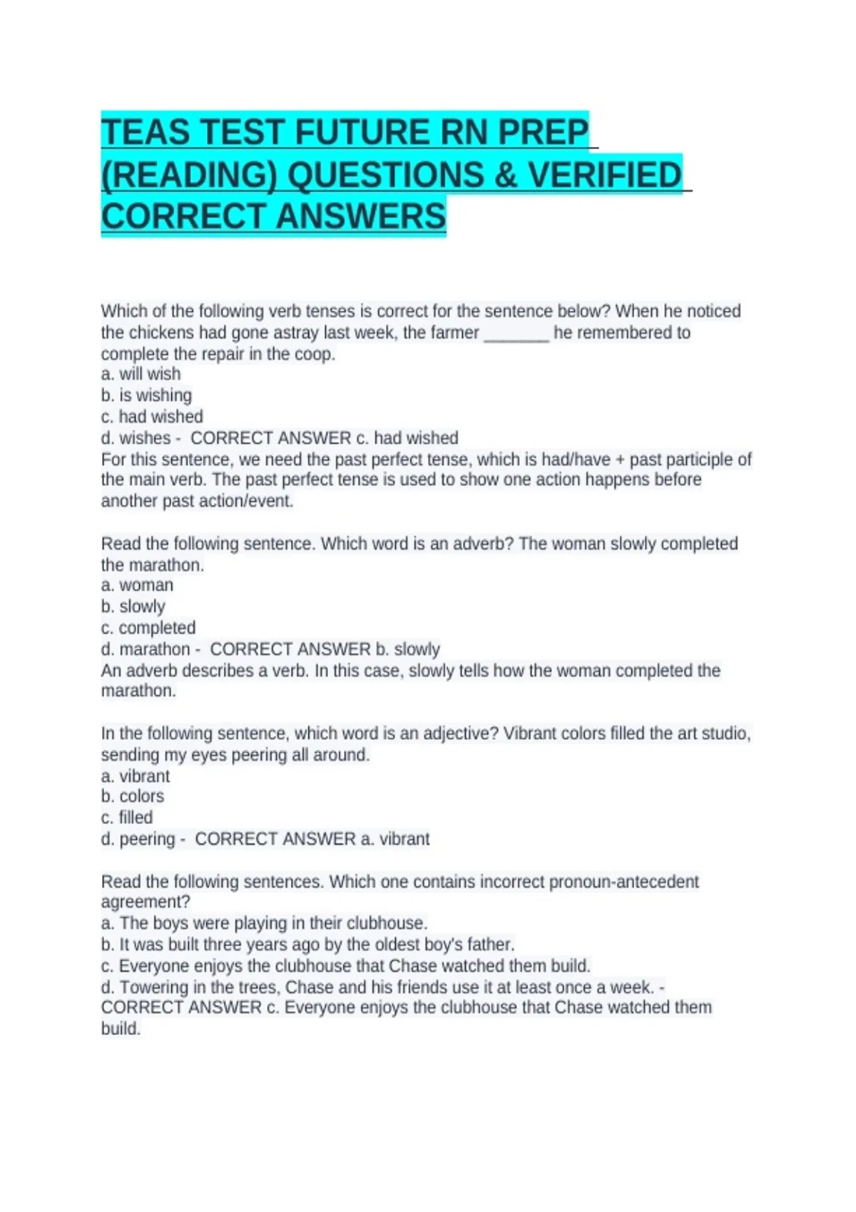 TEAS TEST FUTURE RN PREP (READING) QUESTIONS & VERIFIED CORRECT ANSWERS designed to help students succeed on the ATI TEAS exam, a standardized entrance test required for admission into many nursing and allied health programs. The course focuses on strengthening the core academic skills needed to perform well in healthcare education.