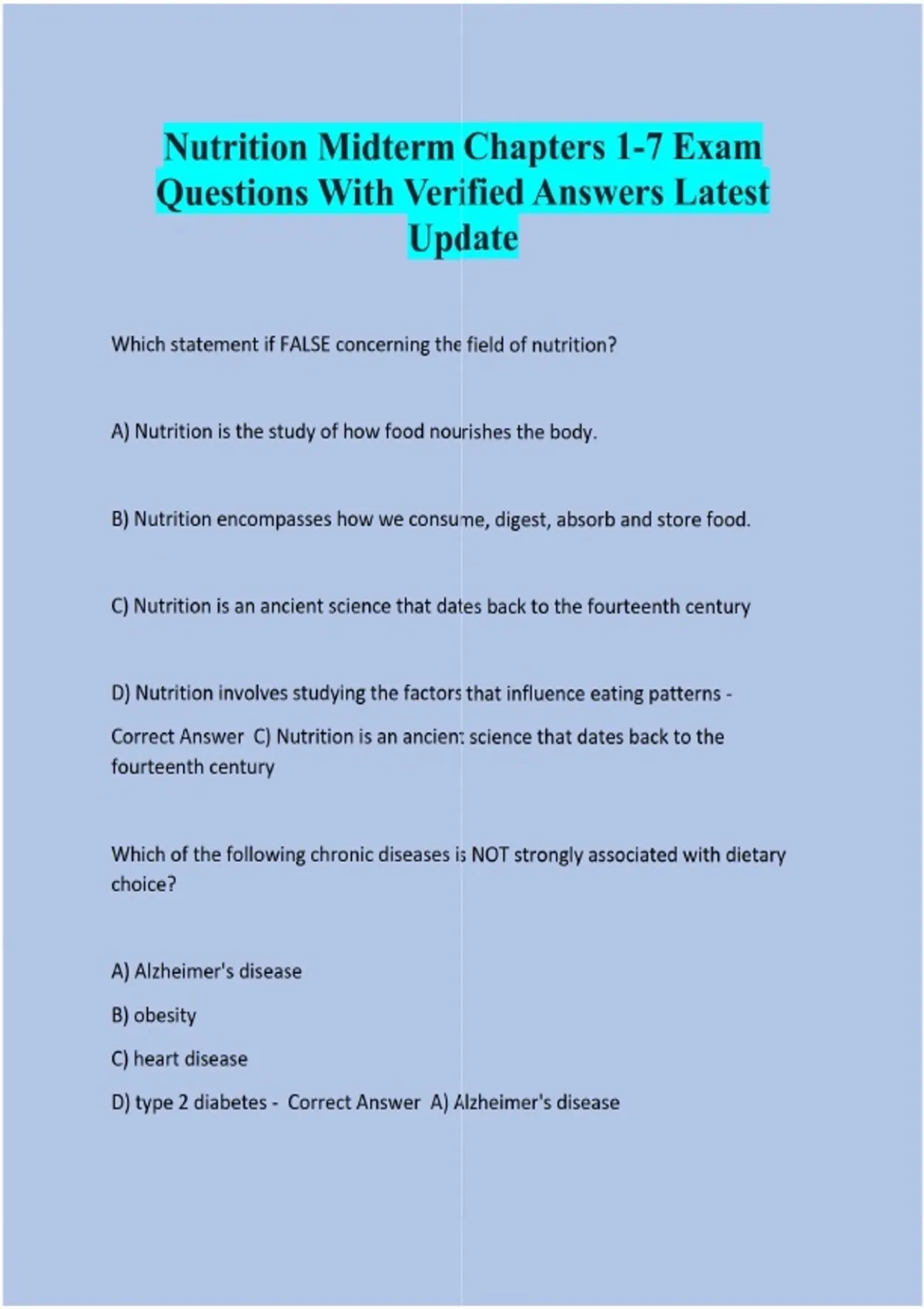 Nutrition Midterm Chapters 1-7 Exam Questions With Verified Answers Latest Update Which statement if FALSE concerning the field of nutrition? A) Nutrition is the study of how food nourishes the body. B) Nutrition encompasses how we consume, digest, absorb and store food. C) Nutrition is an ancient science that dates back to the fourteenth century D) Nutrition involves studying the factors that influence eating patterns - Correct Answer C) Nutrition is an ancient science that dates back to the fourteenth century Which of the following chronic diseases is NOT strongly associated with dietary choice? A) Alzheimer's disease B) obesity C) heart disease D) type 2 diabetes - Correct Answer A) Alzheimer's disease