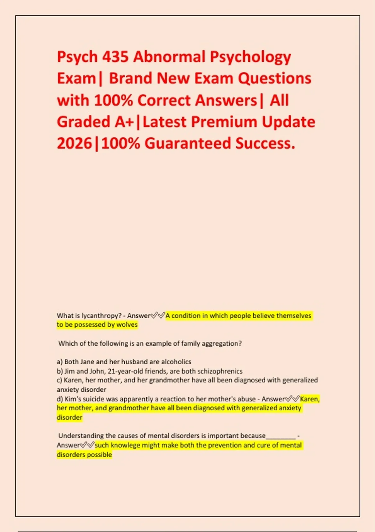 Psych 435 Abnormal Psychology Exam| Brand New Exam Questions with 100% Correct Answers| All Graded A+|Latest Premium Update 2026|100% Guaranteed Success. What is lycanthropy? - AnswerA condition in which people believe themselves to be possessed by wolves Which of the following is an example of family aggregation? a) Both Jane and her husband are alcoholics b) Jim and John, 21-year-old friends, are both schizophrenics c) Karen, her mother, and her grandmother have all been diagnosed with generalized anxiety disorder d) Kim's suicide was apparently a reaction to her mother's abuse - AnswerKaren, her mother, and grandmother have all been diagnosed with generalized anxiety disorder Understanding the causes of mental disorders is important because________ - Answersuch knowlege might make both the prevention and cure of mental disorders possible Benjamin Rush, who encouraged more humane treatment of the mentally ill in the United States, used as his prinicpal remedies________ - Answerbloodletting and the tranquilizer chair Which variable is manipulated in an experiment? - Answerindependent What does the case of JGH, a Native American elder illustrate? - Answera person may focus on somatic symptoms rather than mood when depressed Which of the following factors has a significant effect on the rates of severe mental illness among Americans? a) family size b) gender c) geographic region of the country d) political affiliation - Answergender If fraternal (or dizygotic) twins are more likely to be concordant for a trait than other siblings, can it be concluded that the higher concordance rate is due to the greater degree of genetic relatedness? - AnswerNo, because fraternal twins are no more genetically alike than other siblinings Archaeology and early writings indicate the first people to think of the brain as the site of mental functions were the ________ - Answerancient Egyptians The effects of early social deprivation _______ - Answerare explained differently by the various psychosocial perspectives. Behaviourism was_________ - Answera reaction to what the behaviorist perceived as a lack of scientific rigour in psychoanalysis Which of the following most accurately describes the notion of different viewpoints of abnormal behaviour? - Answereach viewpoint offers its own explanation of abnormal behavior In Dr. Lu's study of eating disorders, she looked at the academic histories of girls with an eating disorer and girls who didn't have such problems. In this example, the girls with eating disorders are the ____group - Answercriterion Medications for psychological disorders _________ - Answerwere first used centuries ago After cheating on her husband and feeling ashamed, Julia accused her husband of cheating. Such behaviour is explained by which of the following defense mechanisms? - Answerprojection
