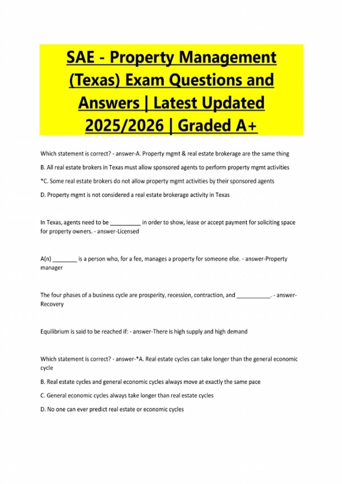 SAE - Property Management (Texas) Exam Questions and Answers | Latest Updated 2025/2026 | Graded A+ Which statement is correct? - answer-A. Property mgmt & real estate brokerage are the same thing B. All real estate brokers in Texas must allow sponsored agents to perform property mgmt activities *C. Some real estate brokers do not allow property mgmt activities by their sponsored agents D. Property mgmt is not considered a real estate brokerage activity in Texas In Texas, agents need to be __________ in order to show, lease or accept payment for soliciting space for property owners. - answer-Licensed A(n) ________ is a person who, for a fee, manages a property for someone else. - answer-Property manager The four phases of a business cycle are prosperity, recession, contraction, and ___________. - answerRecovery Equilibrium is said to be reached if: - answer-There is high supply and high demand Which statement is correct? - answer-*A. Real estate cycles can take longer than the general economic cycle B. Real estate cycles and general economic cycles always move at exactly the same pace C. General economic cycles always take longer than real estate cycles D. No one can ever predict real estate or economic cycles__________ is every avenue a business pursues in order to reach out to the public to be seen. - answerMarketing The ____________ is the physical location the product can be found. - answer-Place The __________ include: product, promotion, price, and place. - answer-The Four P's of Marketing Property management companies that operate under the __________ have dedicated property managers who are involved with every aspect of the properties they manage. - answer-Portfolio structure _________ are charged to each client to cover all of the services the property manager provides. - answer-Management fees Which of the following is true? - answer-A. It is better to be conservative on expenses and liberal on income B. Owners do not usually mind if the actual budget far exceeds the estimated budget C. The actual budget and the estimated budget almost always match exactly *D. When budgeting for owners, property managers need to be conservative on income and liberal on expenses The fiduciary duties a property manager owes to the owner are _________, loyalty, disclosure, confidentiality, accounting, and reasonable care. - answer-Obedience Which of the following should be included in a property management agreement? - answer-A. Policies and procedures for the repair of the property B. Duties and responsibilities of the property manger C. The management term *D. All of these Which statement regarding reserves is incorrect? - answer-A. Reserve amounts are established based on the age, size, and residential profile of the propertyB. Older, larger properties will need more money in reserves to pay for repairs, etc. C. Reserves are held by the property manager to pay services providers and other costs associated with managing the property *D. The money for reserves comes from the property manager's own business accounts