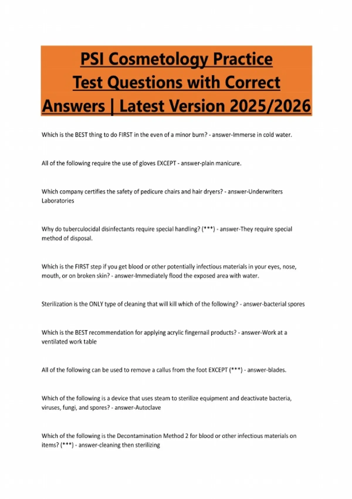PSI Cosmetology Practice Test Questions with Correct Answers | Latest Version 2025/2026 Which is the BEST thing to do FIRST in the even of a minor burn? - answer-Immerse in cold water. All of the following require the use of gloves EXCEPT - answer-plain manicure. Which company certifies the safety of pedicure chairs and hair dryers? - answer-Underwriters Laboratories Why do tuberculocidal disinfectants require special handling? (***) - answer-They require special method of disposal. Which is the FIRST step if you get blood or other potentially infectious materials in your eyes, nose, mouth, or on broken skin? - answer-Immediately flood the exposed area with water. Sterilization is the ONLY type of cleaning that will kill which of the following? - answer-bacterial spores Which is the BEST recommendation for applying acrylic fingernail products? - answer-Work at a ventilated work table All of the following can be used to remove a callus from the foot EXCEPT (***) - answer-blades. Which of the following is a device that uses steam to sterilize equipment and deactivate bacteria, viruses, fungi, and spores? - answer-Autoclave Which of the following is the Decontamination Method 2 for blood or other infectious materials on items? (***) - answer-cleaning then sterilizingWhich is the first step in disinfecting implements? - answer-Scrub with soap and water Which of the following should you offer a client, for draping, when waxing underarms? - answer-terry wrap Which of the following is a sterilizer approved for salon use? (***) - answer-Autoclave Which of the following is the FIRST step in properly cleaning a footpath tub? (***) - answer-Drain the water from a footpath and remove any visible debris. Which of the following is the FIRST step in responding to a blood exposure incident? - answer-Stop the service All of the following are viruses that plague humans EXCEPT - answer-milaria rubra