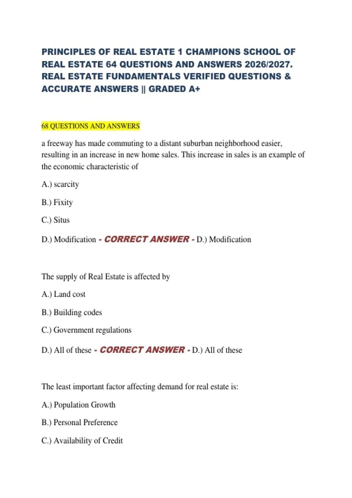PRINCIPLES OF REAL ESTATE 1 CHAMPIONS SCHOOL OF REAL ESTATE 64 QUESTIONS AND ANSWERS 2026/2027. REAL ESTATE FUNDAMENTALS VERIFIED QUESTIONS & ACCURATE ANSWERS || GRADED A+ 68 QUESTIONS AND ANSWERS a freeway has made commuting to a distant suburban neighborhood easier, resulting in an increase in new home sales. This increase in sales is an example of the economic characteristic of A.) scarcity B.) Fixity C.) Situs D.) Modification - CORRECT ANSWER - D.) Modification