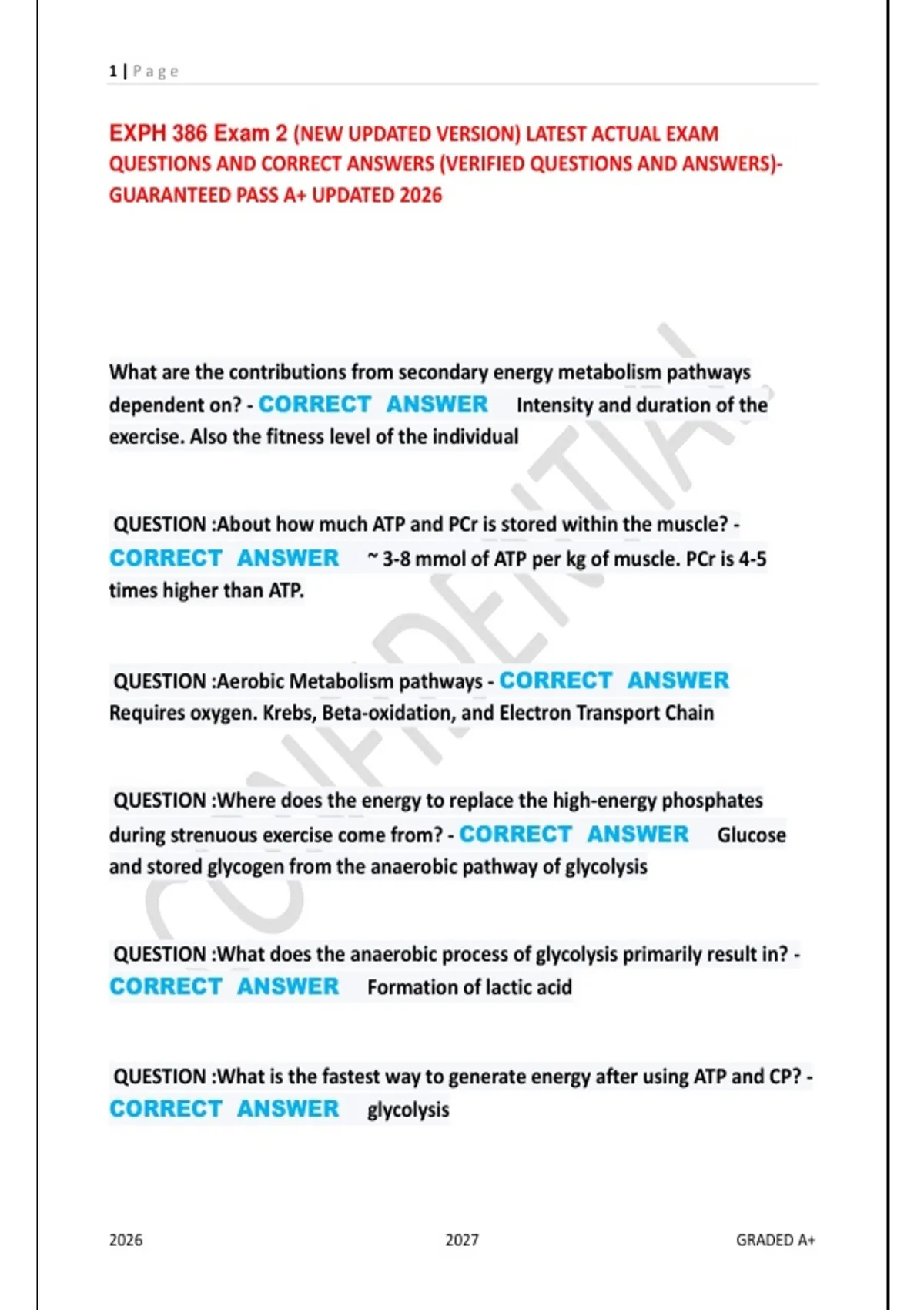 EXPH 386 Exam 2 Study Guide 2026: High-Yield Concepts & Practice Questions Prepare for EXPH 386 Exam 2 with this updated study guide focusing on essential exercise physiology concepts. Topics include energy systems, muscle physiology, cardiovascular and respiratory responses to exercise, and principles of training. Representative practice questions with detailed explanations help reinforce understanding and application. Ideal for students aiming to perform well and build mastery of core EXPH concepts. Use structured review strategies and practice items to increase confidence and exam readiness.