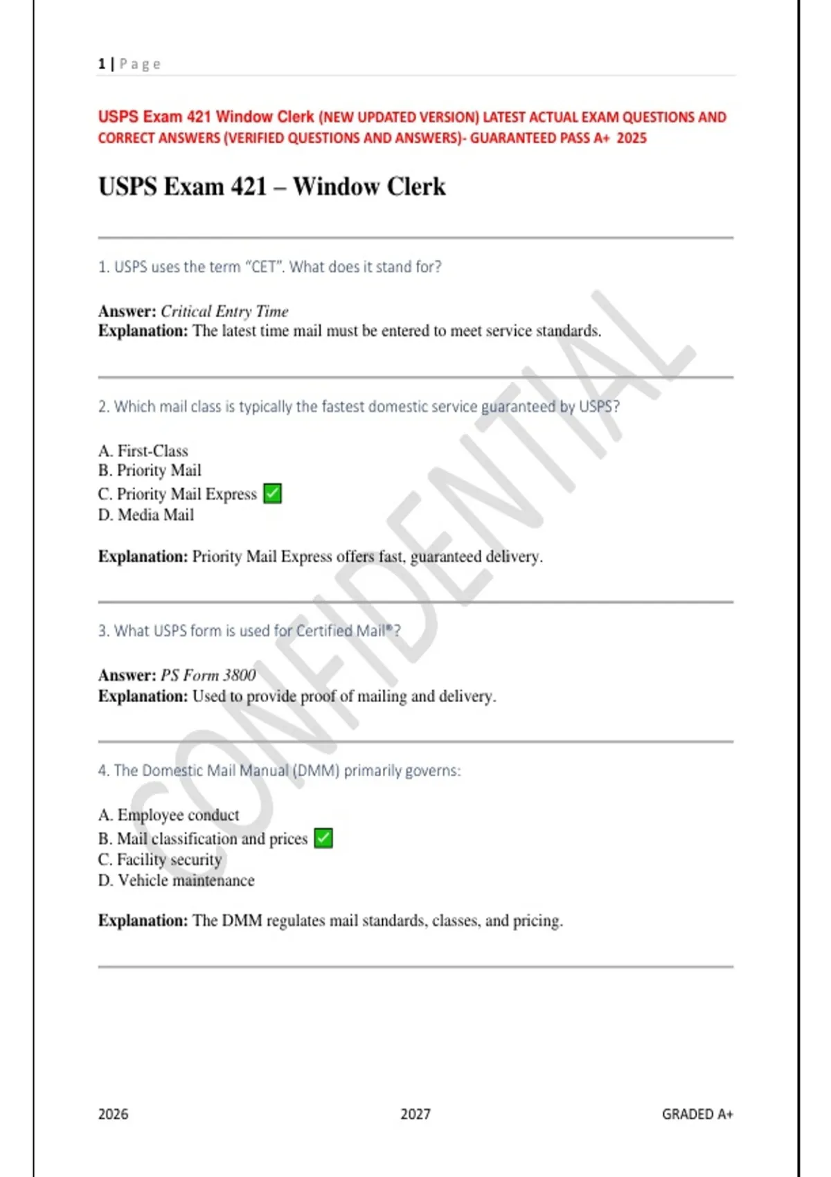 USPS Exam 421 Window Clerk (NEW UPDATED VERSION) LATEST ACTUAL EXAM QUESTIONS AND