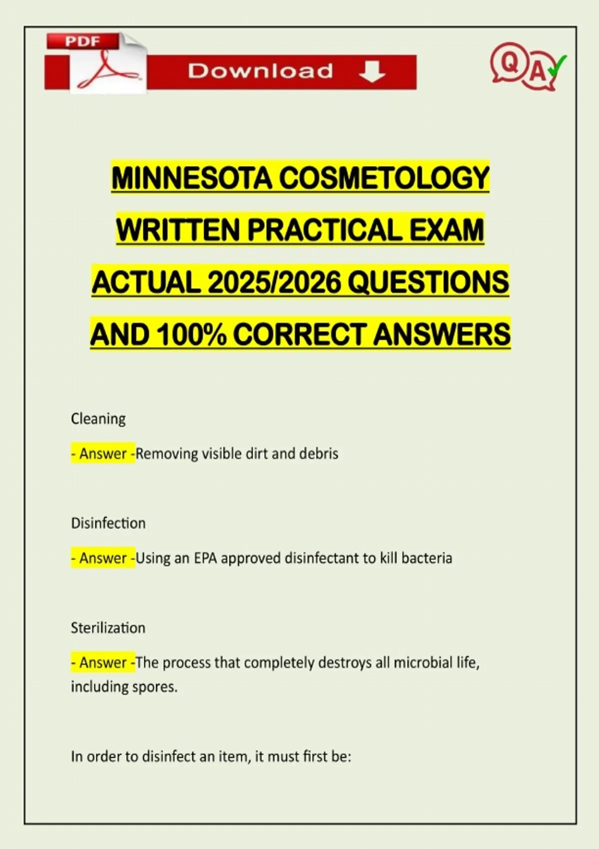 MINNESOTA COSMETOLOGY WRITTEN PRACTICAL EXAM ACTUAL 2025/2026 QUESTIONS AND 100% CORRECT ANSWERS Cleaning - Answer -Removing visible dirt and debris Disinfection - Answer -Using an EPA approved disinfectant to kill bacteria Sterilization - Answer -The process that completely destroys all microbial life, including spores. In order to disinfect an item, it must first be:Need assistance on Online classes, Exams & Assignments? Reach out for instant help!! Full Course Assistance, Plagiarism-free Essay Writing, Research Paper, Dissertation, Discussion Posts, etc…. Confidential & Secure services. Tutors are available for all subjects! Email now at: - Answer -Cleaned of visible dirt of debris What must be worn at all times when handling barbacide? - Answer -Gloves How long must items be fully submerged during disinfection? - Answer -10 minutes