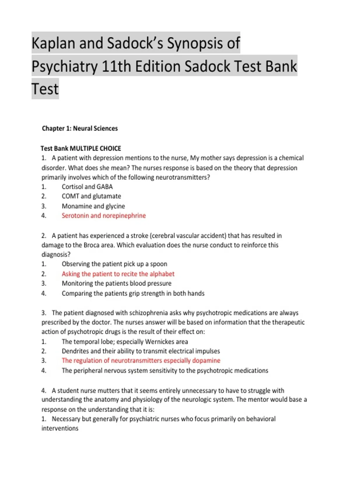 Test Bank for Kaplan and Sadock’s Synopsis of Psychiatry 11th Edition Sadock , latest edition 2024