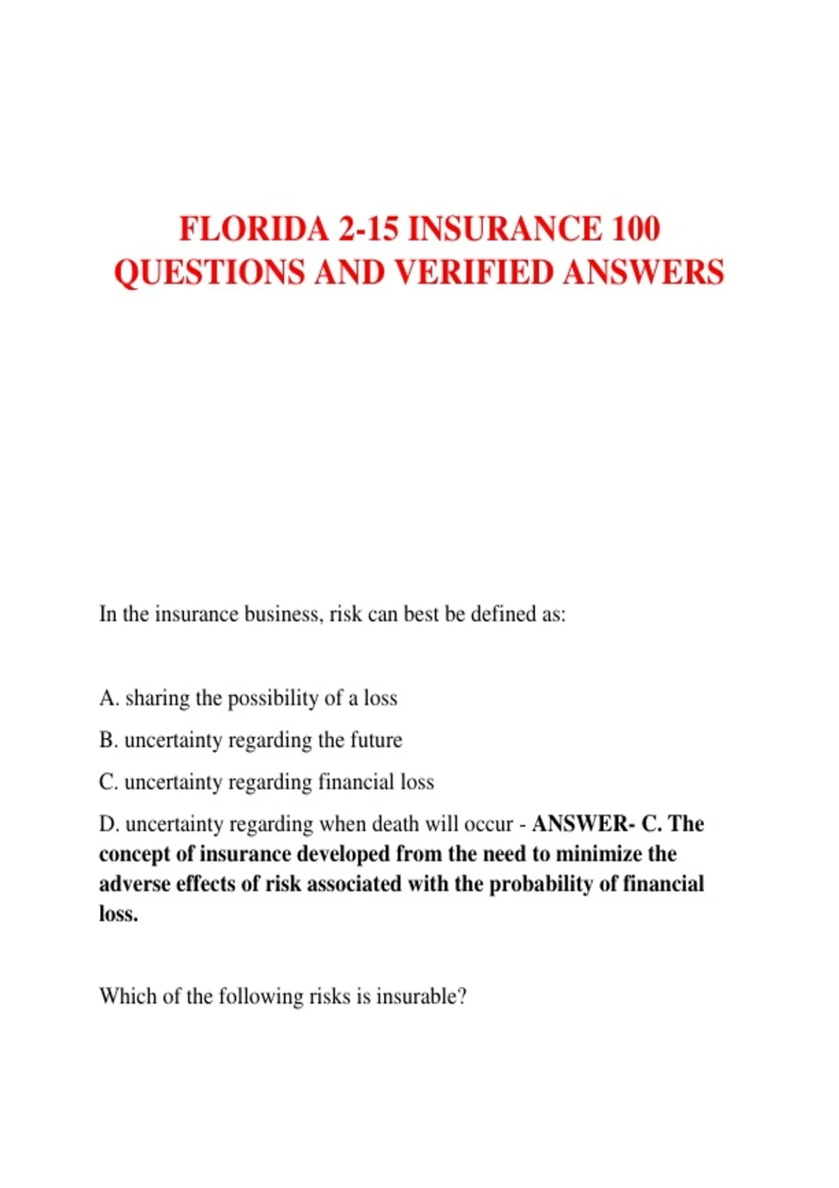 D. investing - ANSWER- A. Only pure risks are insurable because