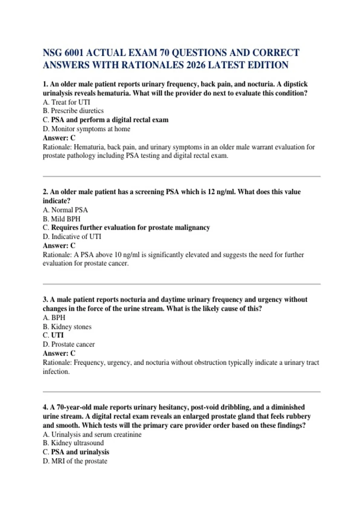 4. A 70-year-old male reports urinary hesitancy, post-void dribbling, and a diminished