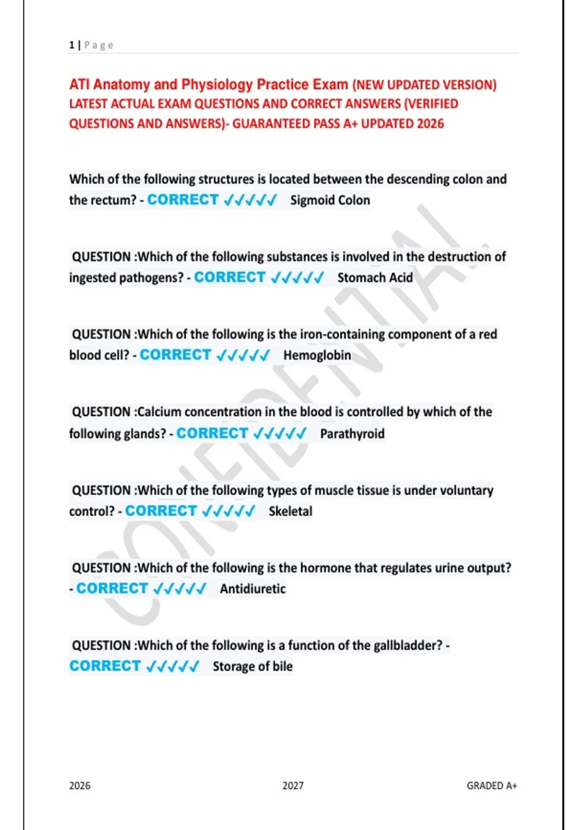 ATI Anatomy and Physiology Practice Exam (NEW UPDATED VERSION)