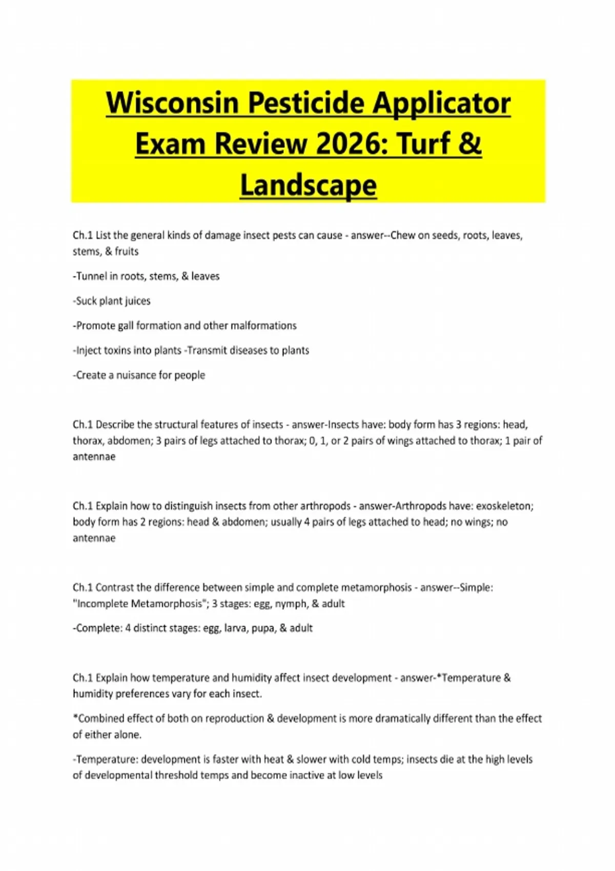 Wisconsin Pesticide Applicator Exam Review 2026: Turf & Landscape Ch.1 List the general kinds of damage insect pests can cause - answer--Chew on seeds, roots, leaves, stems, & fruits -Tunnel in roots, stems, & leaves -Suck plant juices -Promote gall formation and other malformations -Inject toxins into plants -Transmit diseases to plants -Create a nuisance for people Ch.1 Describe the structural features of insects - answer-Insects have: body form has 3 regions: head, thorax, abdomen; 3 pairs of legs attached to thorax; 0, 1, or 2 pairs of wings attached to thorax; 1 pair of antennae Ch.1 Explain how to distinguish insects from other arthropods - answer-Arthropods have: exoskeleton; body form has 2 regions: head & abdomen; usually 4 pairs of legs attached to head; no wings; no antennae Ch.1 Contrast the difference between simple and complete metamorphosis - answer--Simple: "Incomplete Metamorphosis"; 3 stages: egg, nymph, & adult -Complete: 4 distinct stages: egg, larva, pupa, & adult Ch.1 Explain how temperature and humidity affect insect development - answer-*Temperature & humidity preferences vary for each insect. *Combined effect of both on reproduction & development is more dramatically different than the effect of either alone. -Temperature: development is faster with heat & slower with cold temps; insects die at the high levels of developmental threshold temps and become inactive at low levels-Humidity: effects insect diseases; effects moisture levels required for survival Ch.1 List the advantages and disadvantages of using insecticides - answer-Advantages: -Effective against economically damaging pests -Can combine 1 or 2 insecticides to combat several pests -They act quickly to control pests before reaching damaging levels -For new pests, there are many compounds that have been proven effective -Effective insecticides, suitable formulations, & application equipment are normally available Disadvantages: -Often eliminate beneficial insects, allowing target organisms to rebound quickly -Repeated exposure can lead to resistance in a pest population -Yearly dependence on applications is an added cost -Always a potential for drift, residues, and damage Ch.2 Explain what determines whether a given plant is a weed - answer-Weeds are unwanted plants Ch.2 List the two main goals of weed management - answer-1. Minimize weed competition 2. Limit the weed's reproduction so that you can still manage the weed population in future years Ch.2 Describe ways that weeds can pose problems in turf and landscapes (7) - answer--Interfere with management practices -Produce chemical inhibitors that directly retard the growth of desirable plants (allelopathy) -Create a poor impression on customers -Interferes with pesticide applications -Support insect pests and plant diseases or provide cover for rodents -Are poisonous, allergenic, or irritating to people or pets -Dry out or die and become fire hazards