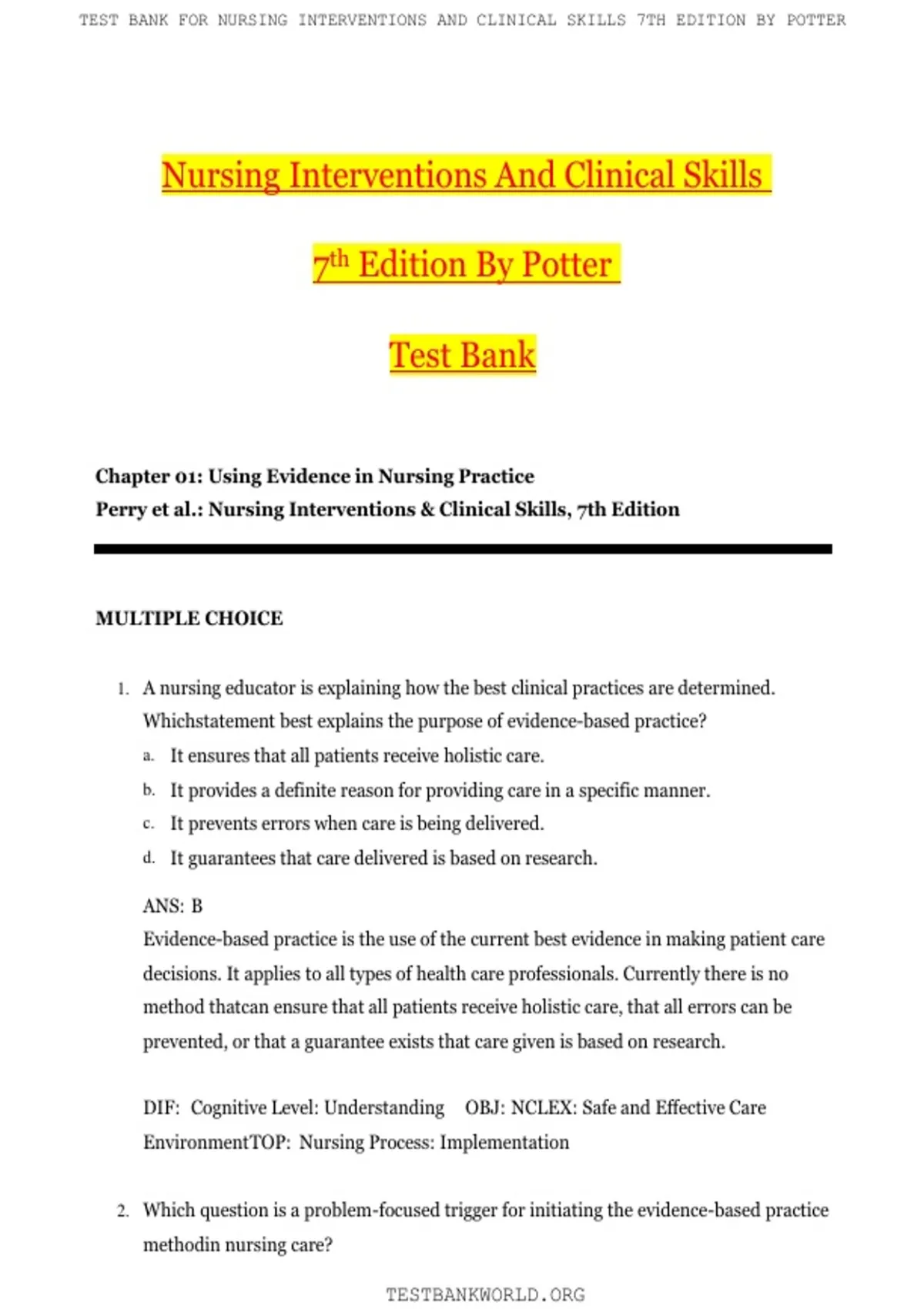 , TEST BANK FOR NURSING INTERVENTIONS AND CLINICAL SKILLS 7TH EDITION BY POTTER