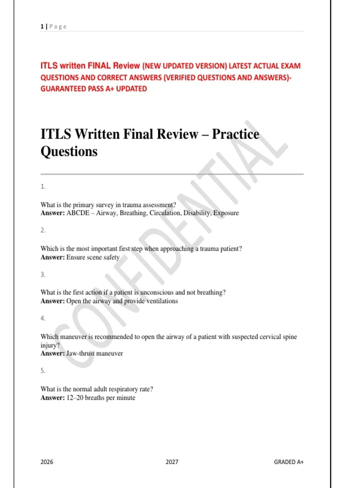 Prepare for the ITLS Written Final Exam with this updated 2026 study guide covering essential prehospital trauma care concepts. Focused on airway management, shock, trauma assessment, and emergency interventions, this guide reinforces critical knowledge and decision-making skills. Includes ITLS-style practice questions with detailed rationales to strengthen understanding and clinical reasoning. Ideal for EMS professionals and students aiming to excel on the ITLS exam and provide safe patient care. Structured review strategies and scenario-based practice ensure confidence and readiness for the exam.