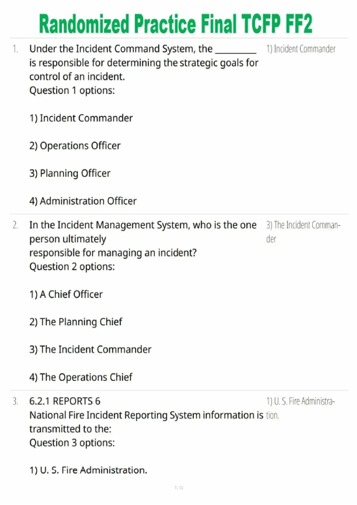 This randomized practice final for TCFP Firefighter II (FF2) certification provides verified exam-style questions and answers updated for 2025–2026. It covers advanced firefighting competencies including suppression strategies, rescue operations, hazardous materials response, incident command systems, and safety protocols. The randomized format ensures comprehensive review across all tested domains, simulating the actual certification exam environment. Designed to reinforce theoretical knowledge and practical application, this resource supports candidates preparing for TCFP Firefighter II certification, promotional exams, or continuing education requirements in fire protection services.