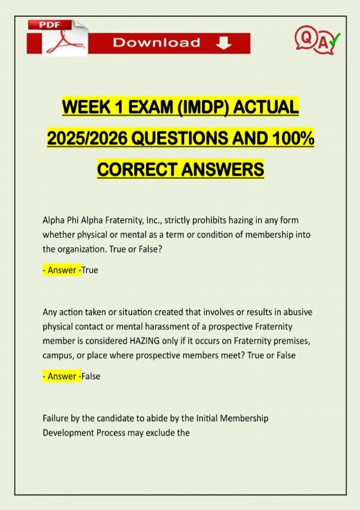 WEEK 1 EXAM (IMDP) ACTUAL 2025/2026 QUESTIONS AND 100% CORRECT ANSWERS Alpha Phi Alpha Fraternity, Inc., strictly prohibits hazing in any form whether physical or mental as a term or condition of membership into the organization. True or False? - Answer -True Any action taken or situation created that involves or results in abusive physical contact or mental harassment of a prospective Fraternity member is considered HAZING only if it occurs on Fraternity premises, campus, or place where prospective members meet? True or False - Answer -False Failure by the candidate to abide by the Initial Membership Development Process may
