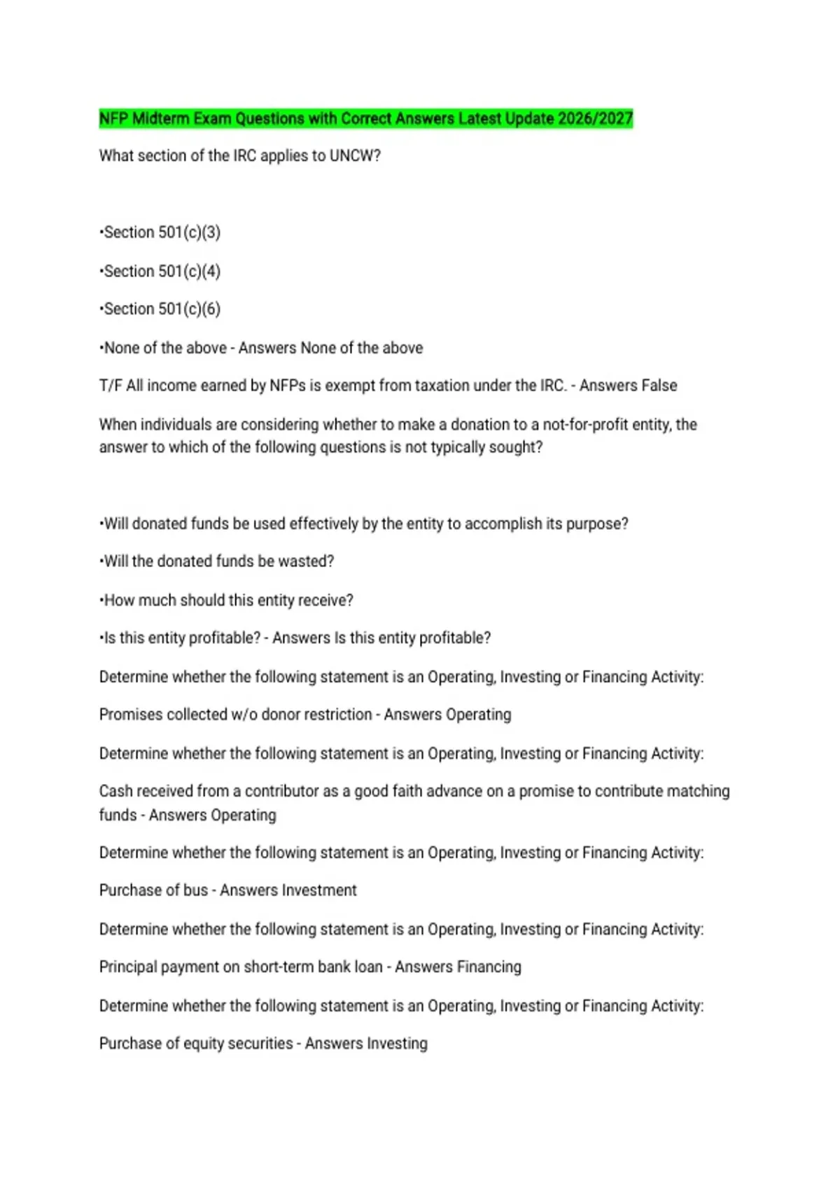 T/F All income earned by NFPs is exempt from taxation under the IRC. - Answers False