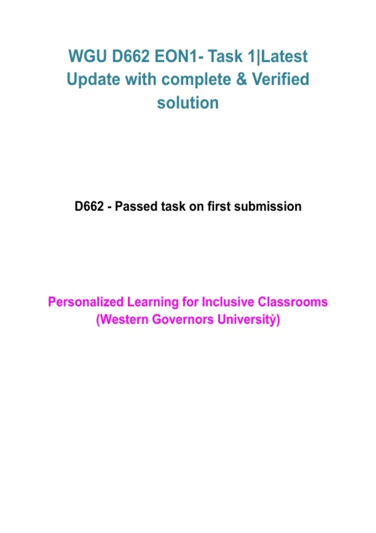 This document provides a clear and organized overview of WGU D662 EON1 Task 1, focusing on the foundational principles of equitable learning environments and their application in educational settings. It addresses key themes such as equity versus equality, inclusive practices, culturally responsive instruction, and support for diverse learners. The content is aligned with the most recent WGU task expectations for the 2026/2027 academic period and is designed to help students understand how to meet all rubric requirements with well-supported, original responses.