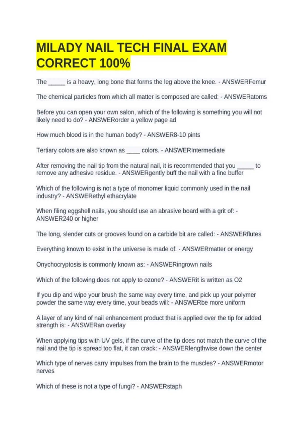 MILADY NAIL TECH FINAL EXAM CORRECT 100%
