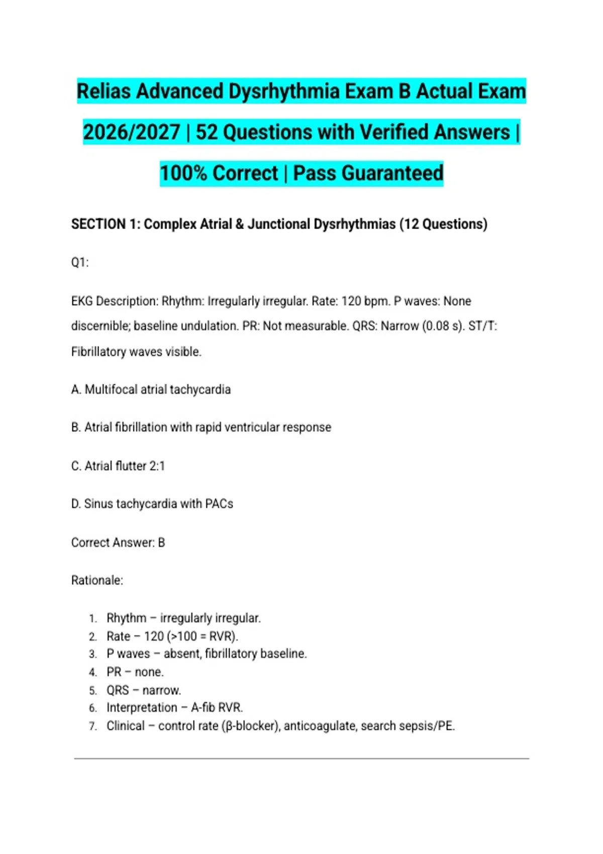 Relias Advanced Dysrhythmia Exam B Actual Exam 2026/2027 | 52 Questions with Verified Answers | 100% Correct | Pass Guaranteed