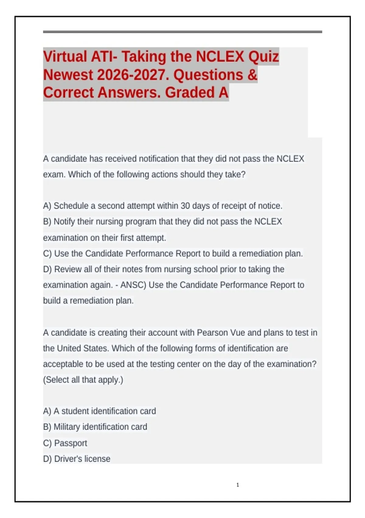 Virtual ATI- Taking the NCLEX Quiz Newest . Questions & Correct Answers. Graded A