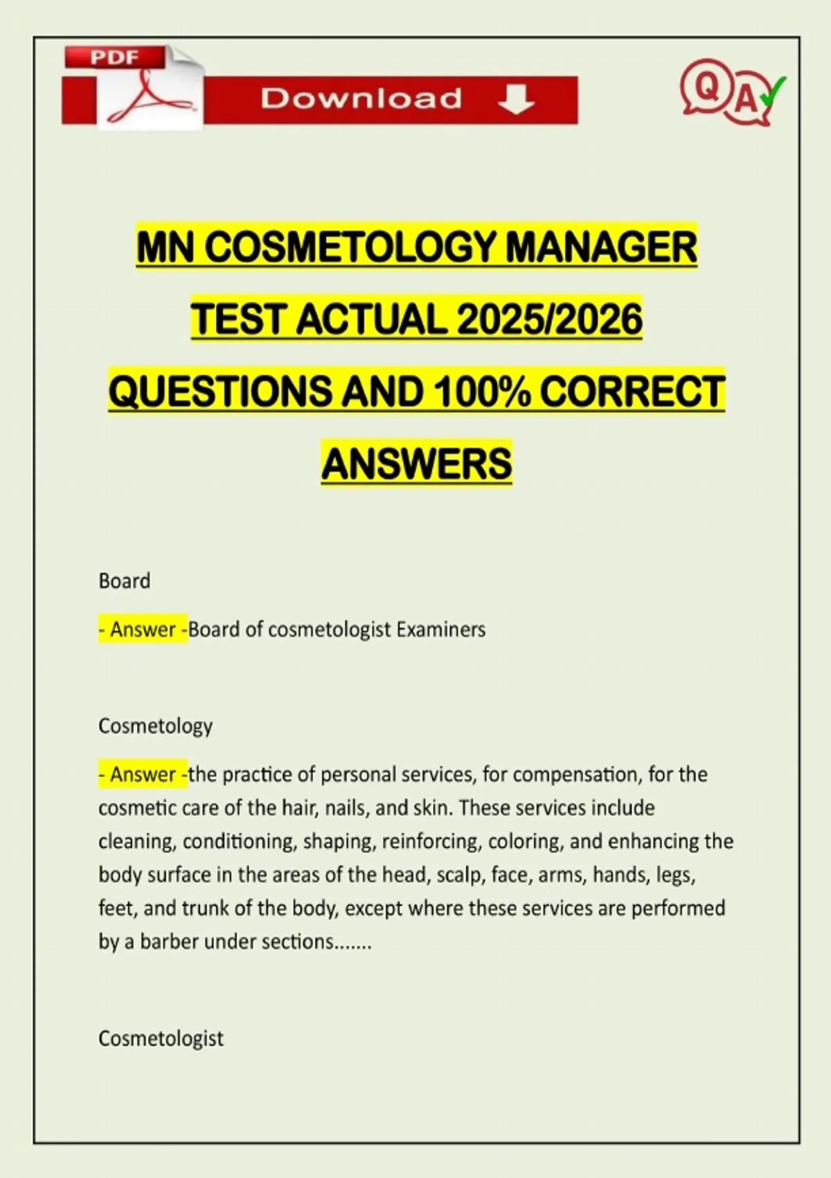 MN COSMETOLOGY MANAGER TEST ACTUAL 2025/2026 QUESTIONS AND 100% CORRECT ANSWERS Board - Answer -Board of cosmetologist Examiners Cosmetology - Answer -the practice of personal services, for compensation, for the cosmetic care of the hair, nails, and skin. These services include cleaning, conditioning, shaping, reinforcing, coloring, and enhancing the body surface in the areas of the head, scalp, face, arms, hands, legs, feet, and trunk of the body, except where these services are performed by a barber under sections....... Cosmetolog