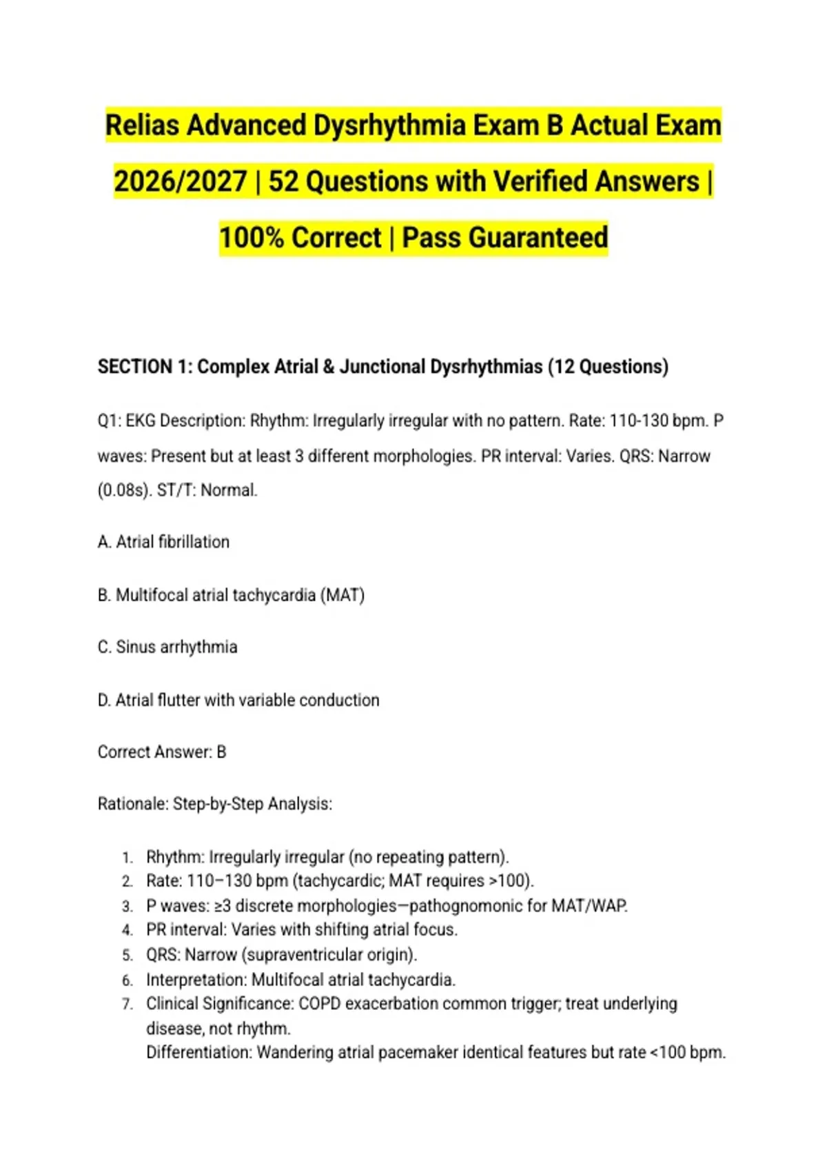 Relias Advanced Dysrhythmia Exam B Actual Exam 2026/2027 | 52 Questions with Verified Answers | 100% Correct | Pass Guaranteed