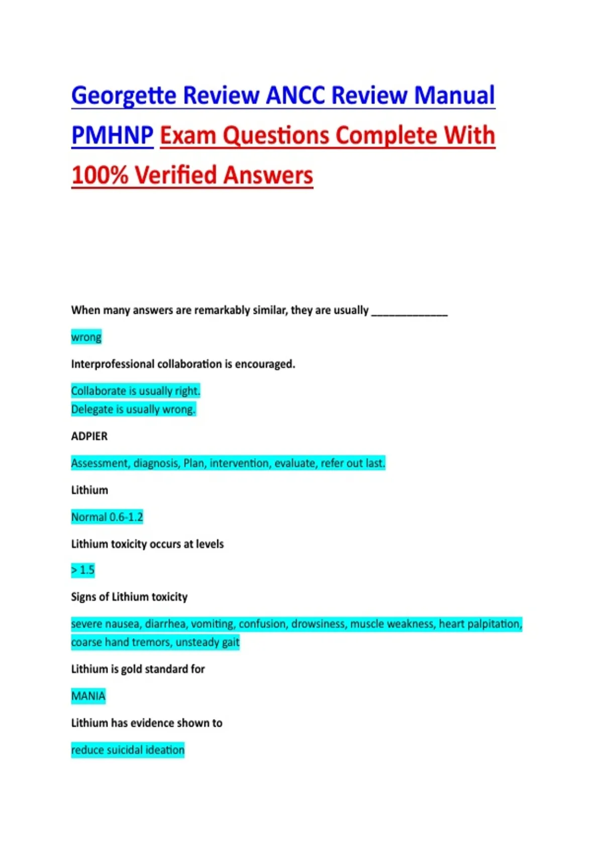Georgette Review ANCC Review Manual PMHNP Exam Questions Complete With 100% Verified Answers