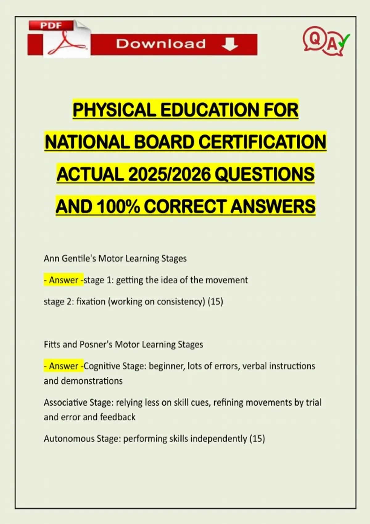 PHYSICAL EDUCATION FOR NATIONAL BOARD CERTIFICATION ACTUAL 2025/2026 QUESTIONS AND 100% CORRECT ANSWERS Ann Gentile's Motor Learning Stages - Answer -stage 1: getting the idea of the movement stage 2: fixation (working on consistency) (15) Fitts and Posner's Motor Learning Stages - Answer -Cognitive Stage: beginner, lots of errors, verbal instructions and demonstrations Associative Stage: relying less on skill c