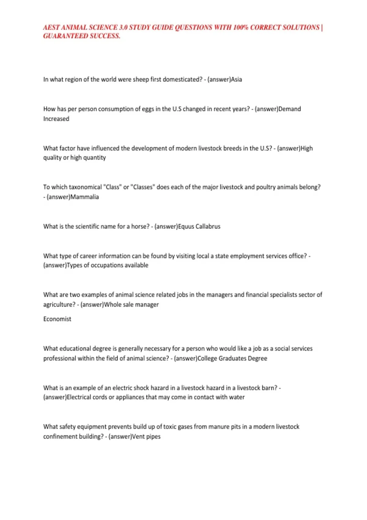 AEST ANIMAL SCIENCE 3.0 STUDY GUIDE QUESTIONS WITH 100% CORRECT SOLUTIONS |