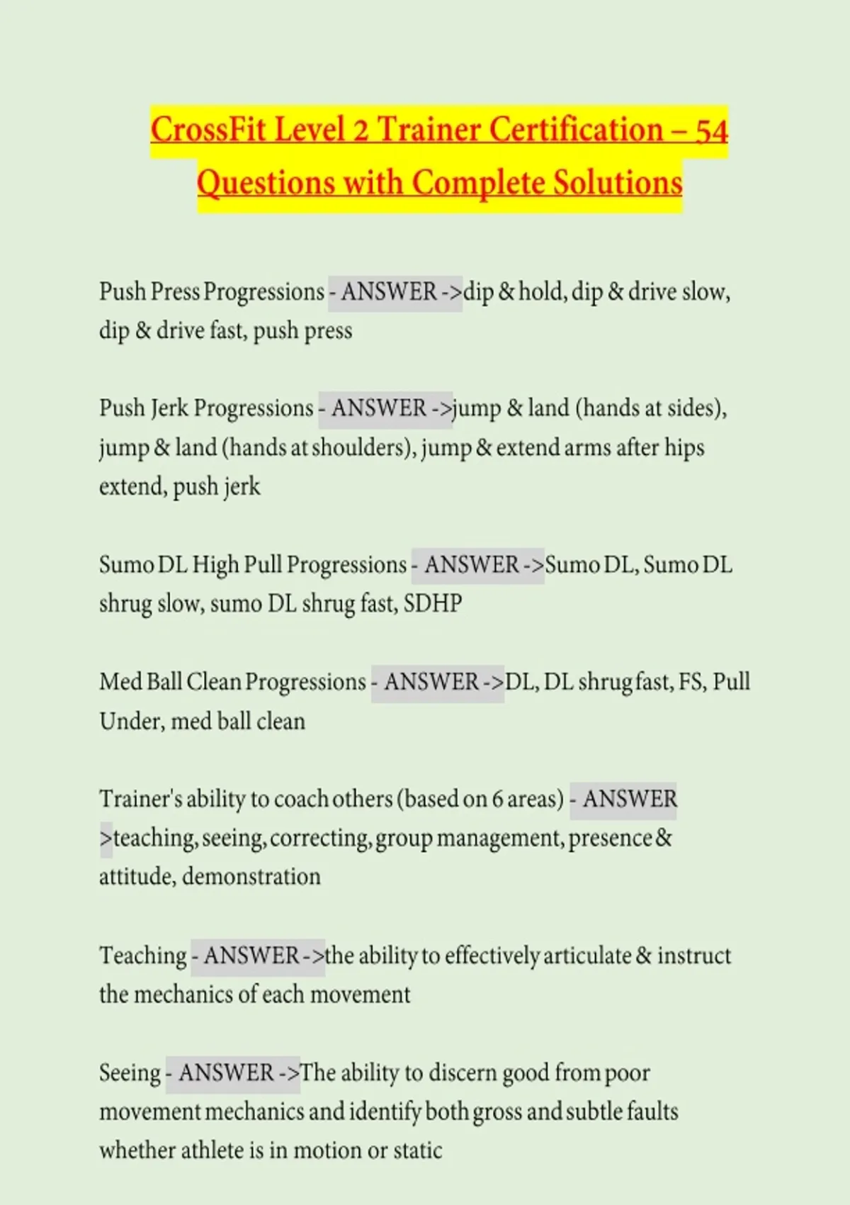 This document includes 54 practice questions for the CrossFit Level 2 Trainer Certification, each provided with clear and complete solutions. It covers advanced coaching principles, movement analysis, program design, scaling, and athlete development, making it a strong resource for exam preparation and in-depth review.