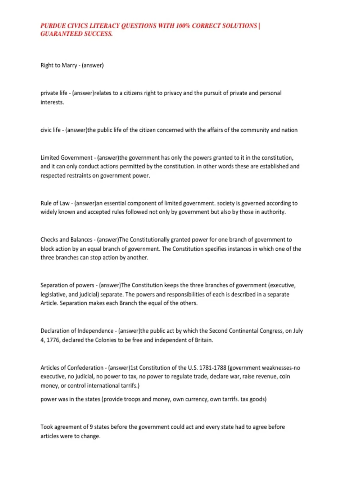 PURDUE CIVICS LITERACY QUESTIONS WITH 100% CORRECT SOLUTIONS | GUARANTEED SUCCESS.