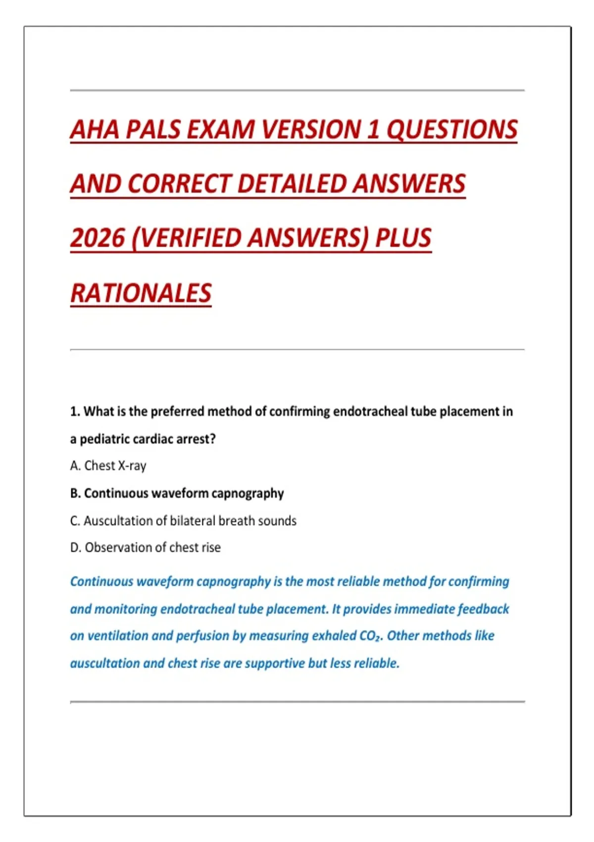 Get fully prepared with this AHA PALS Exam Version 1 (2026) featuring authentic exam-style questions, verified correct answers, and clear, detailed rationales. Designed to reflect the latest AHA PALS standards, this A+ resource is ideal for final review, self-testing, and confident first-time success. Accurate, up to date, and exam-focused.