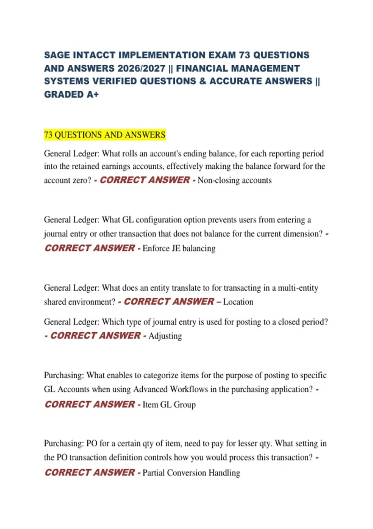 SAGE INTACCT IMPLEMENTATION EXAM 73 QUESTIONS AND ANSWERS 2026/2027 || FINANCIAL MANAGEMENT SYSTEMS VERIFIED QUESTIONS & ACCURATE ANSWERS || GRADED A+
