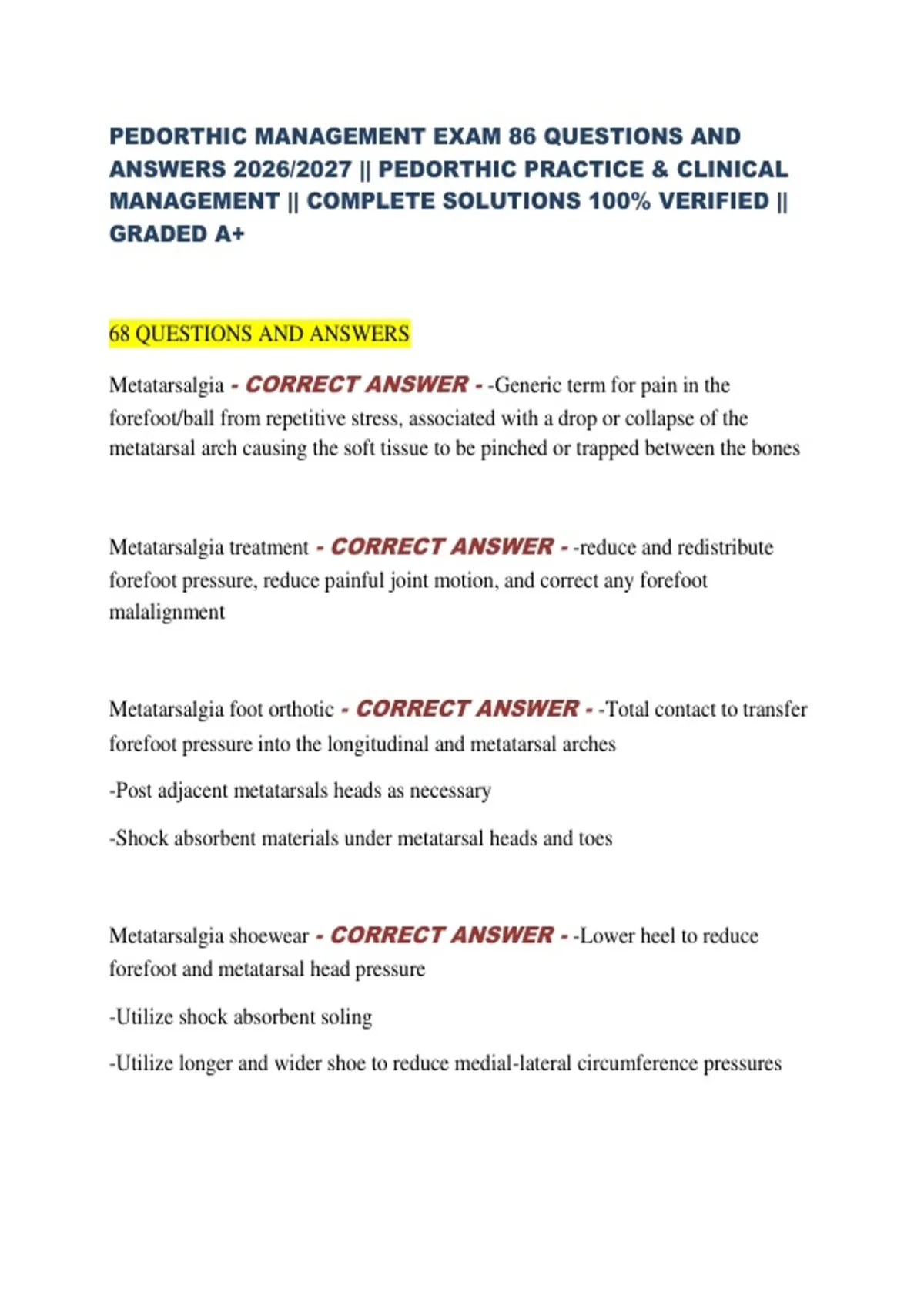 PEDORTHIC MANAGEMENT EXAM 86 QUESTIONS AND ANSWERS 2026/2027 || PEDORTHIC PRACTICE & CLINICAL MANAGEMENT || COMPLETE SOLUTIONS 100% VERIFIED || GRADED A+ 68 QUESTIONS AND ANSWERS Metatarsalgia - CORRECT ANSWER - -Generic term for pain in the forefoot/ball from repetitive stress, associated with a drop or collapse of the metatarsal arch causing the soft tissue to be pinched or trapped between the bones