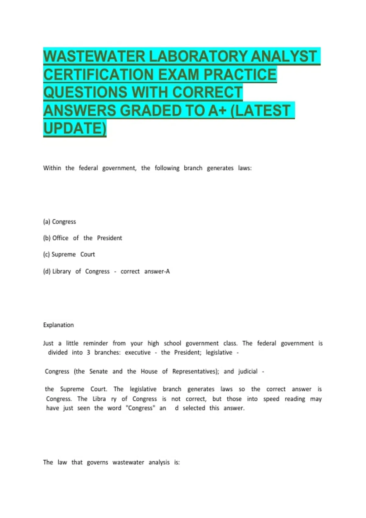 WASTEWATER LABORATORY ANALYST CERTIFICATION EXAM PRACTICE