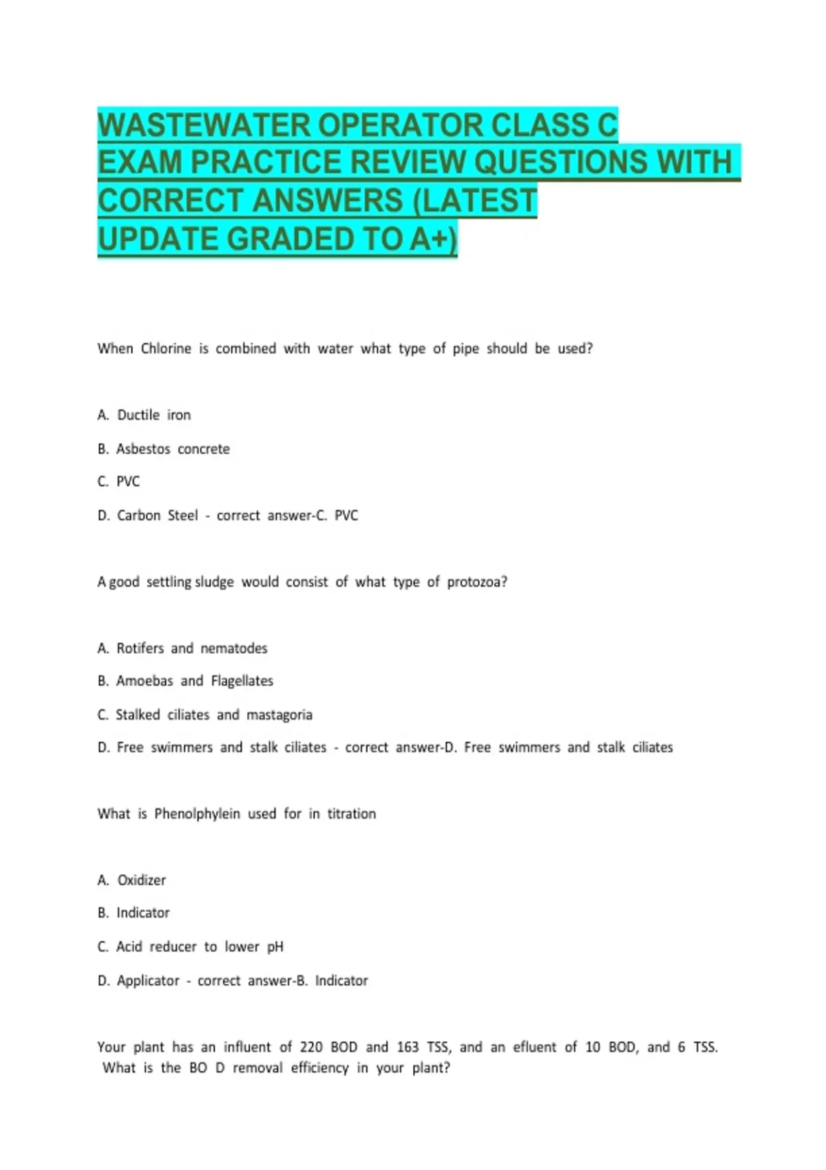 WASTEWATER OPERATOR CLASS C EXAM PRACTICE REVIEW QUESTIONS WITH CORRECT ANSWERS