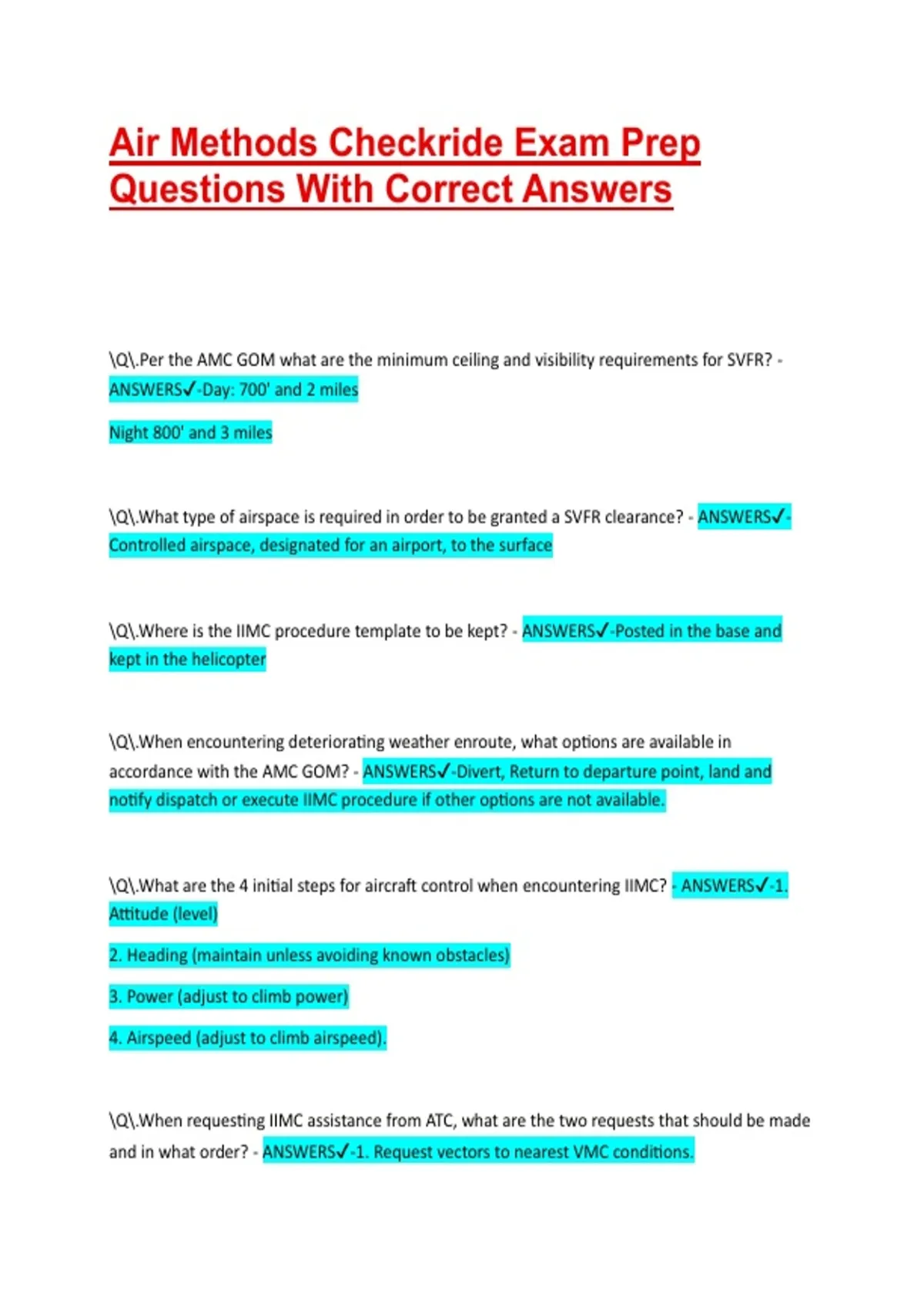 Air Methods Checkride Exam Prep Questions With Correct Answers | 100% Pass Q.Per the AMC GOM what are the minimum ceiling and visibility requirements for SVFR? - ANSWERS-Day: 700' and 2 miles Night 800' and 3 miles Q.What type of airspace is required in order to be granted a SVFR clearance? - ANSWERS-Controlled airspace, designated for an airport, to the surface Q.Where is the IIMC procedure template to be kept? - ANSWERS-Posted in the base and kept in the helicopter Q.When encountering deteriorating weather enroute, what options are available in accordance with the AMC GOM? - ANSWERS-Divert, Return to departure point, land and notify dispatch or execute IIMC procedure if other options are not available. Q.What are the 4 initial steps for aircraft control when encountering IIMC? - ANSWERS-1. Attitude (level) 2. Heading (maintain unless avoiding known obstacles) 3. Power (adjust to climb power) 4. Airspeed (adjust to climb airspeed). Q.When requesting IIMC assistance from ATC, what are the two requests that should be made and in what order? - ANSWERS-1. Request vectors to nearest VMC conditions. 2. Request vectors to closest approach. Q.What steps are involved in the full IIMC procedure? - ANSWERS-1. Maintain aircraft control 2. climb to MSA 3. De-goggle when safely able (if appropriate). 4. Make all turns no greater than standard rate. 5. Contact approach control and declare an emergency (squawk 7700 when able and report location/altitude/heading/fuel status/souls on board/state that IIMC and request assistance). 6. Proceed to VMC condition or execute instrument approach. Q.what are the VFR surface reference requirements for Day/Night in FAR 135.207? - ANSWERS-Day: Must have visual surface reference. Night: Must have visual surface light reference, sufficient to safely control the helicopter. Q.What topic is covered in A021 of the OPSPECS? - ANSWERS-Helicopter emergency medical services operations. Q.What are the VFR weather minimums for G airspace for mountainous flights in the local area during the day? Night? - ANSWERS-Day: 800' and 3 miles vis Night aided: 1000' and 3 miles vis Night unaided: 1500' and 3 miles vis Q.What are the VFR weather minimums for G airspace for mountainous flights outside the local area during the day? Night? - ANSWERS-Day: 1000' and 3 miles vis Night aided: 1000' and 5 miles vis